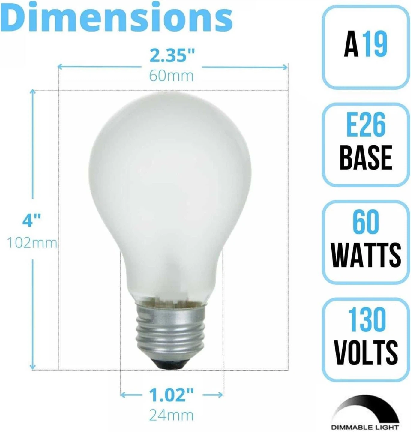 Selling a set of brand new Tractiv 60W incandescent light bulbs! These are A19 bulbs with an E26 base, operating at 130 volts. Each bulb is 60 watts and provides a warm, inviting glow. Dimensions are 2.35" (60mm) in diameter and 4" (102mm) in height