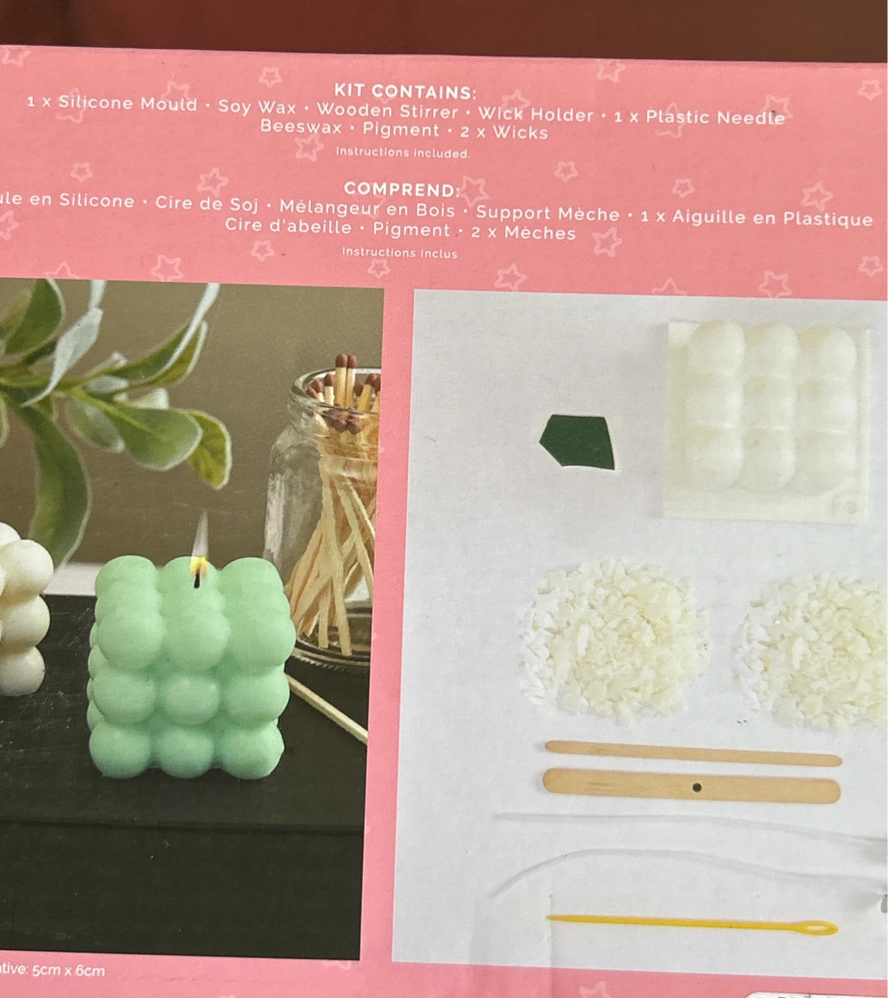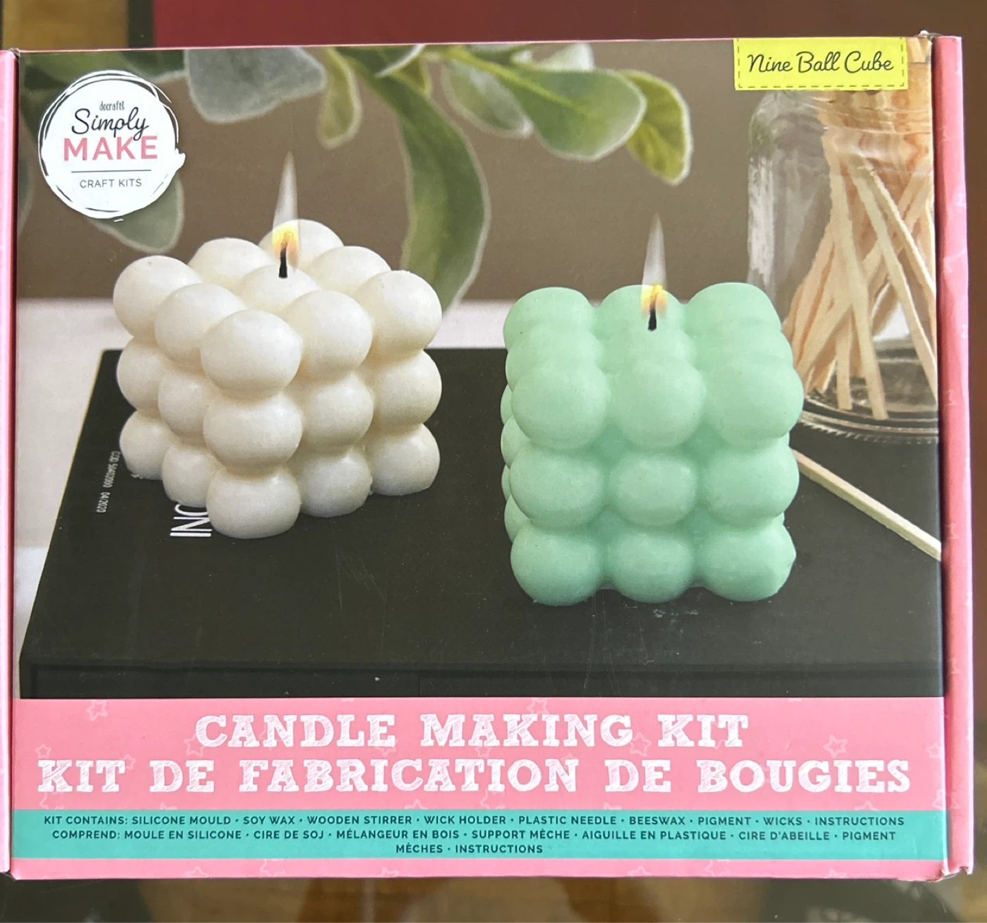 Get crafty with this Simply Make Nine Ball Cube candle making kit! It includes everything you need to create your own unique candles, including a silicone mould, soy wax beeswax, pigment, wicks, and instructions. The kit also contains a wooden stirrer, wick holder, and plastic needle. It comes in its original box and they’re complete.