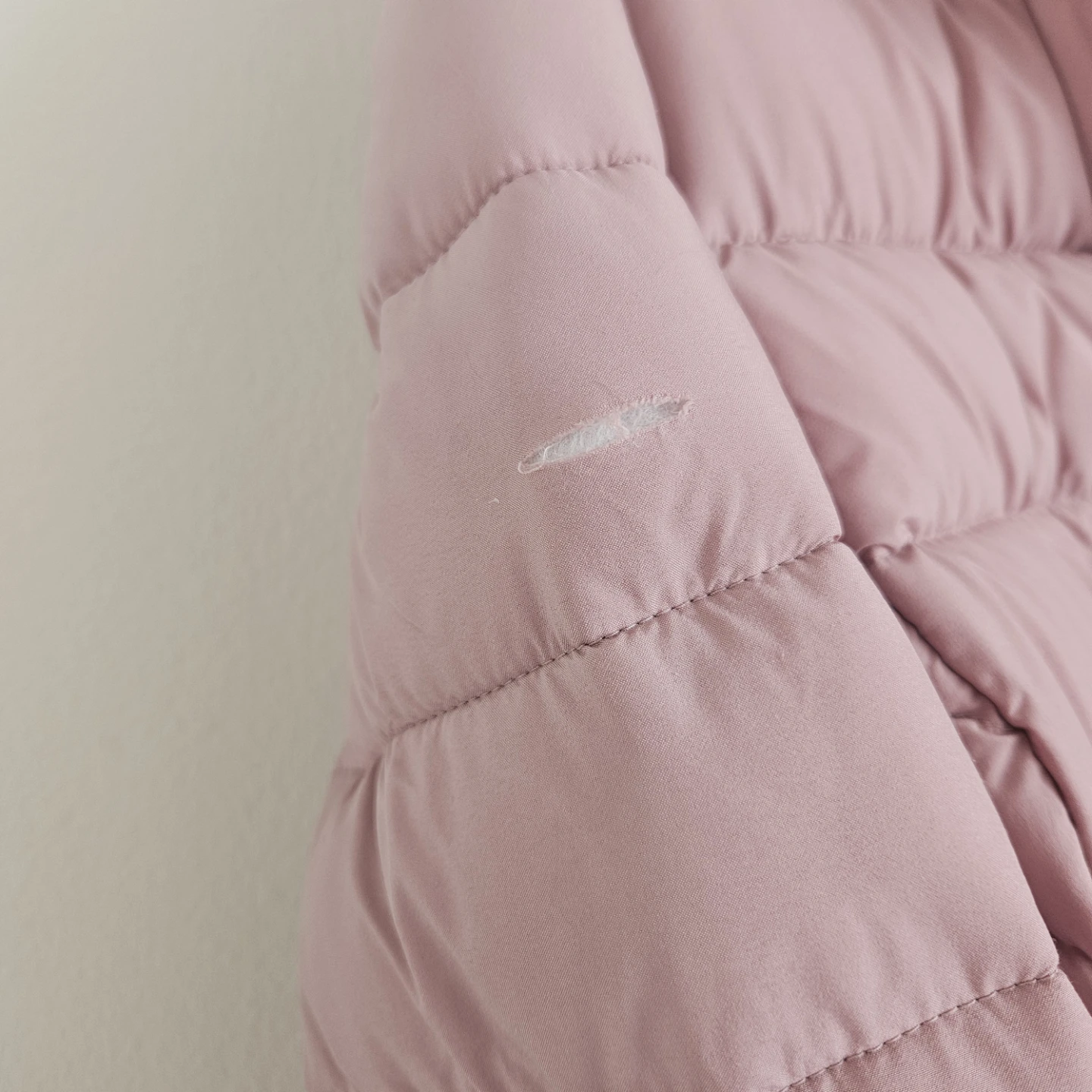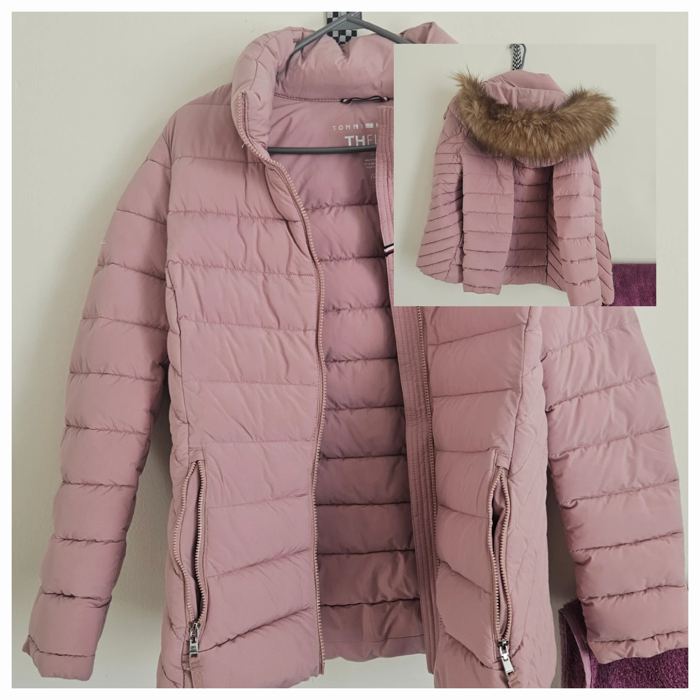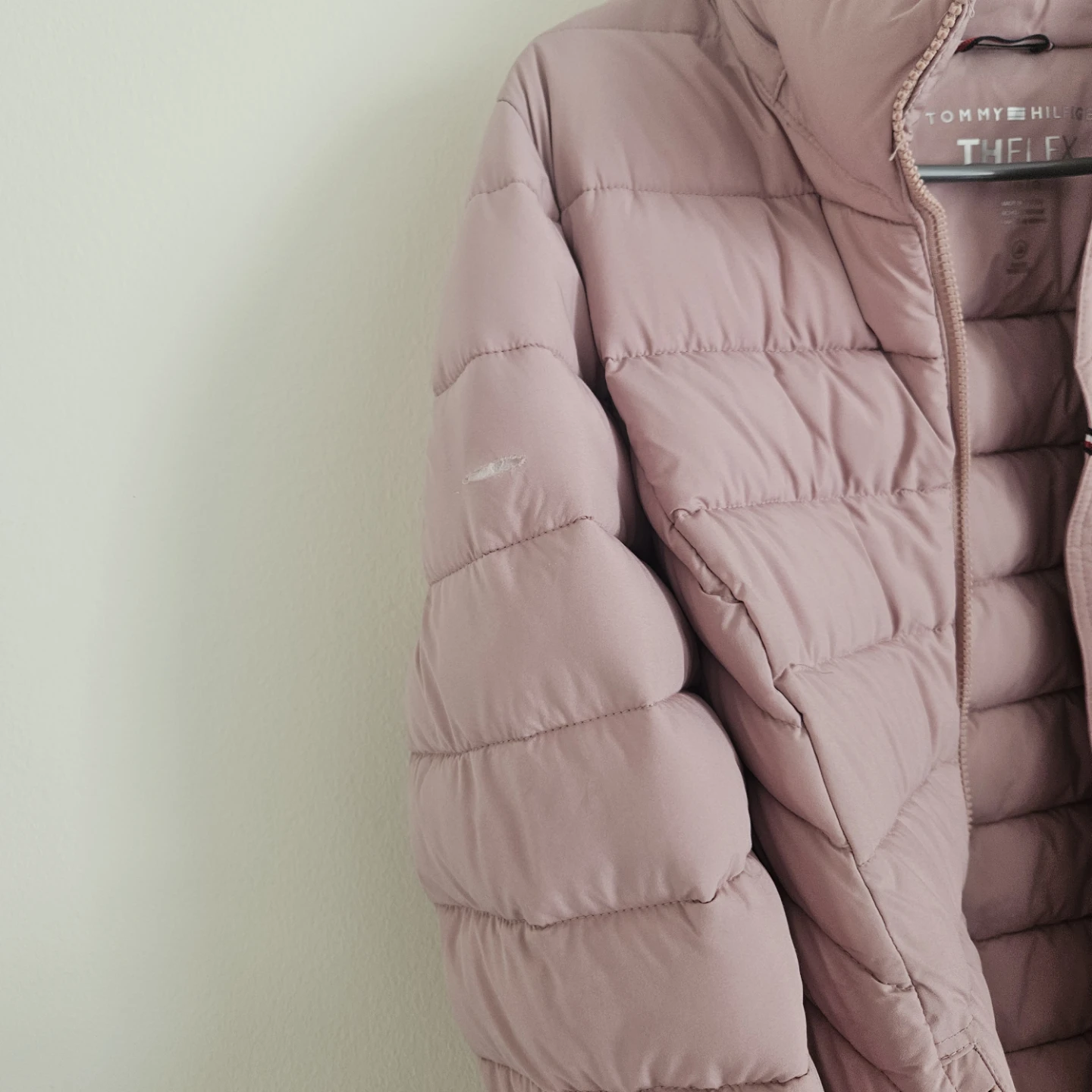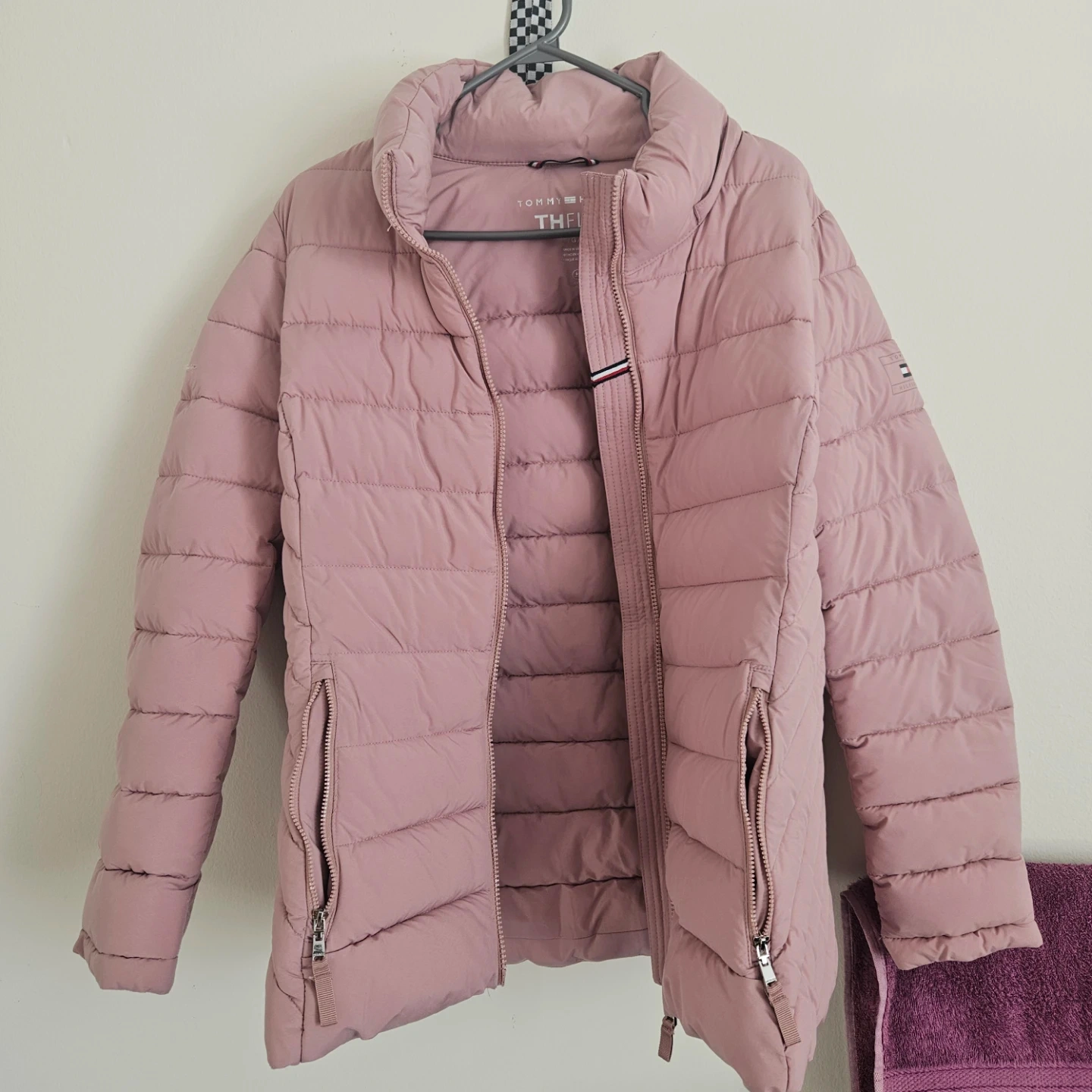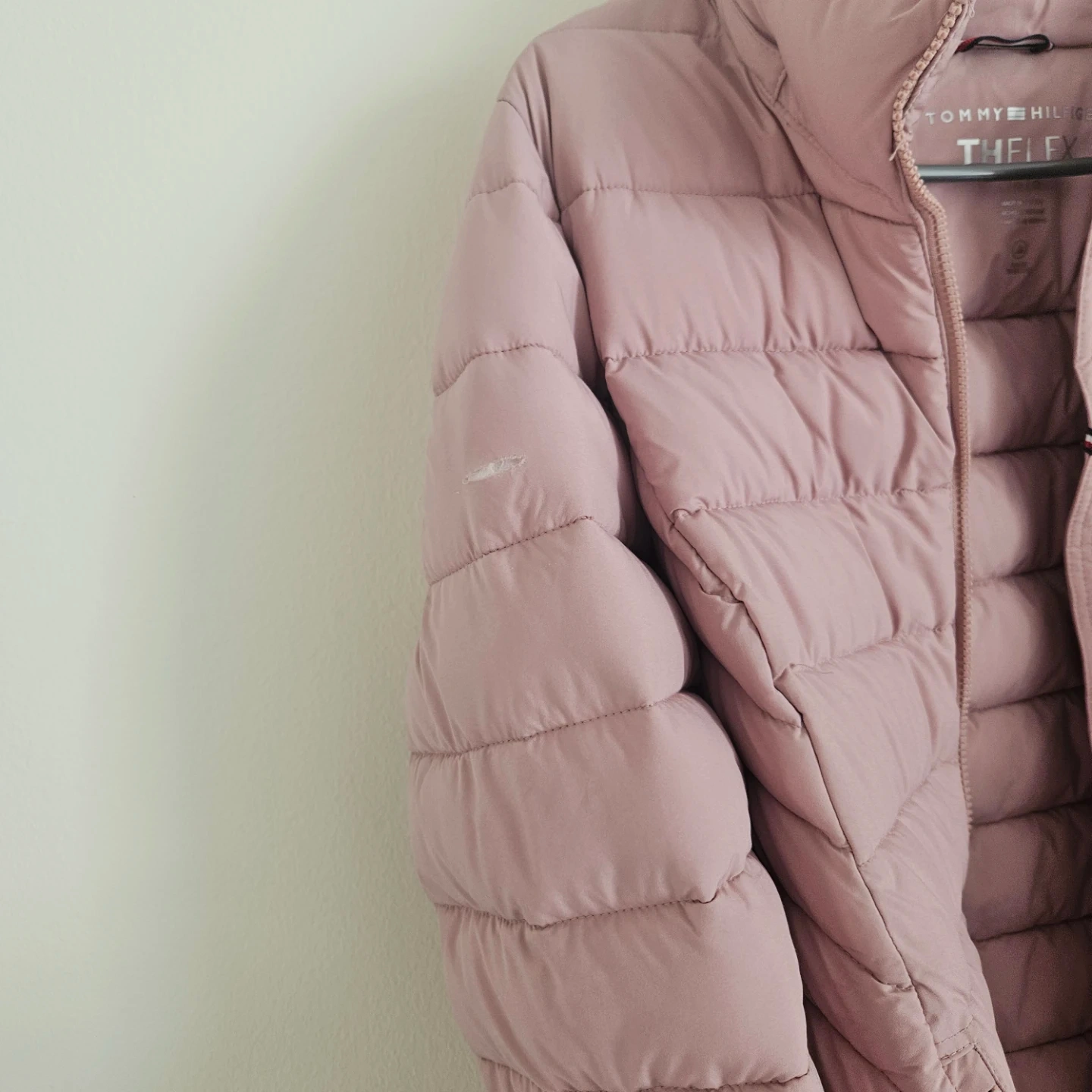 Tommy Hilfiger puffer jacket in size L in a lovely pink colour! There is a small tear on the sleeve, as pictured, but otherwise it's in great shape. Perfect for staying warm and stylish on chilly days. Comes with a detachable hoodie