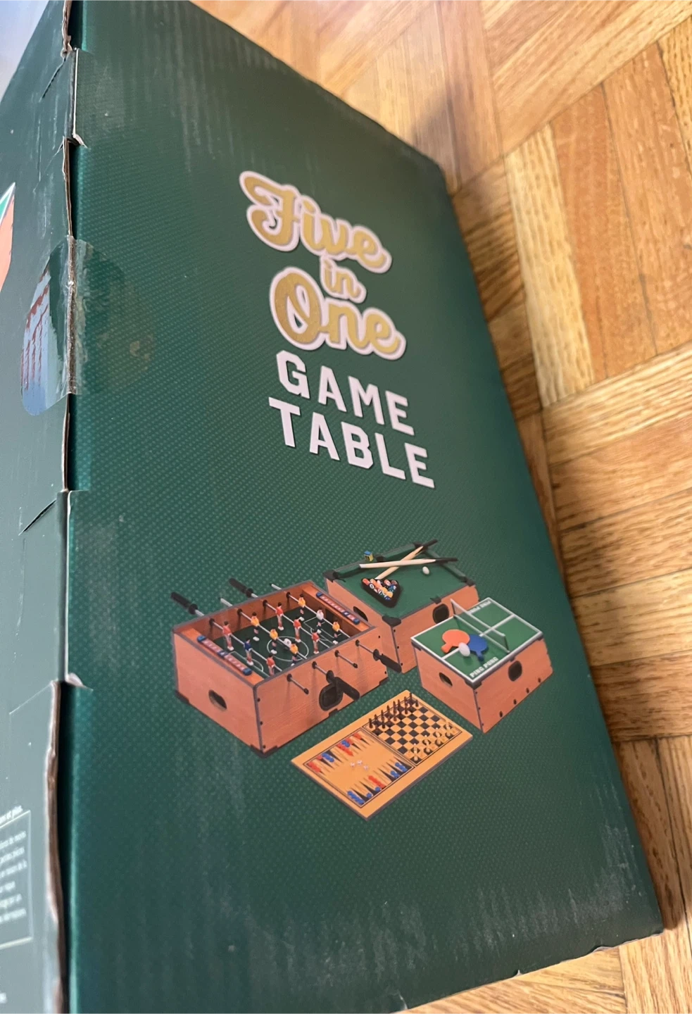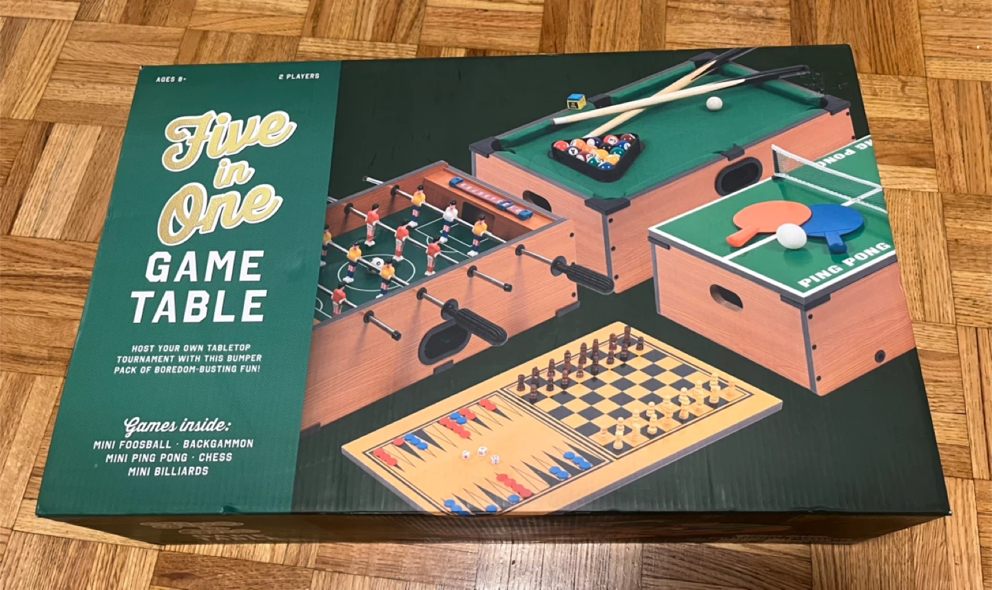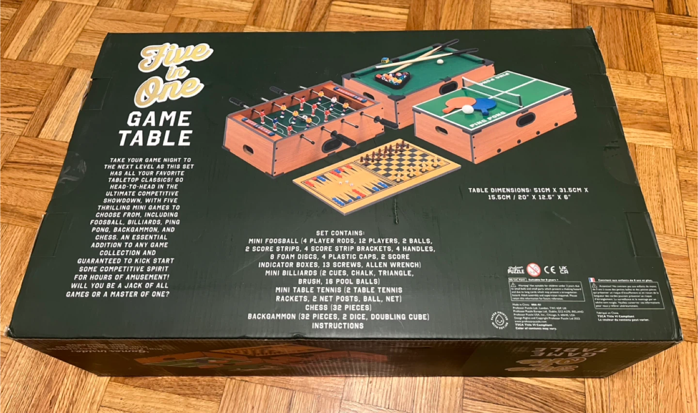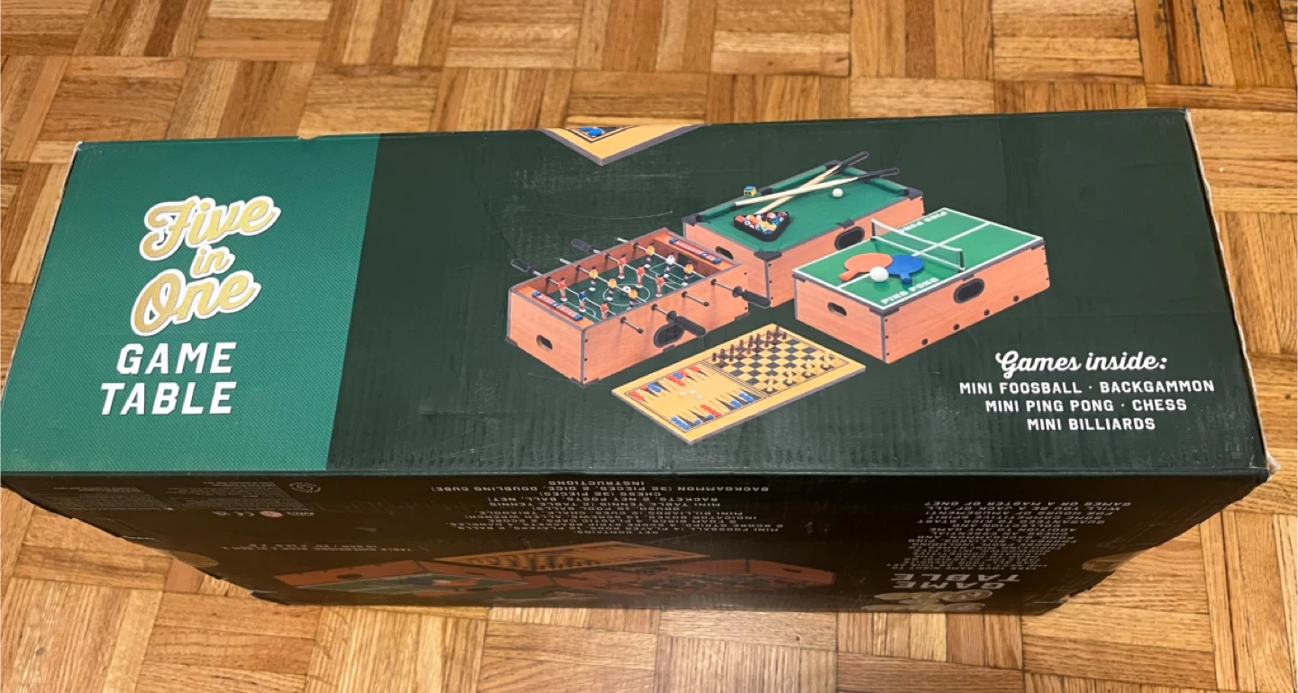 Brand new.This set includes mini foosball, backgammon, ping pong, chess, and mini billiards. The table dimensions are 51cm x 31.5cm x 15.5cm (20 x 12.5 x 6 inches).
