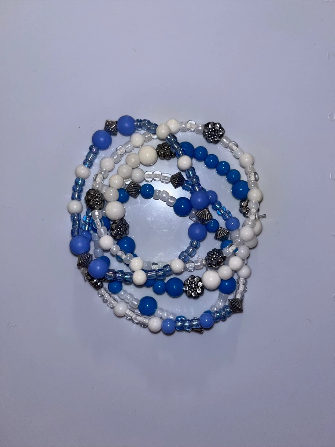827I'm selling a set of handmade beaded bracelets. They feature a mix of blue and white beads with decorative silver accents. Perfect for adding a pop of colour to your outfit! Let me know if interested in purchasing from me thx ππ Pick up only βΊοΈ (available between 11am-6pm) Located at Queen and Sherbourne intersection π Check out my listings for more deals! π€© π₯ Bundle items for a discounted price (excluding items $5 and under)π₯