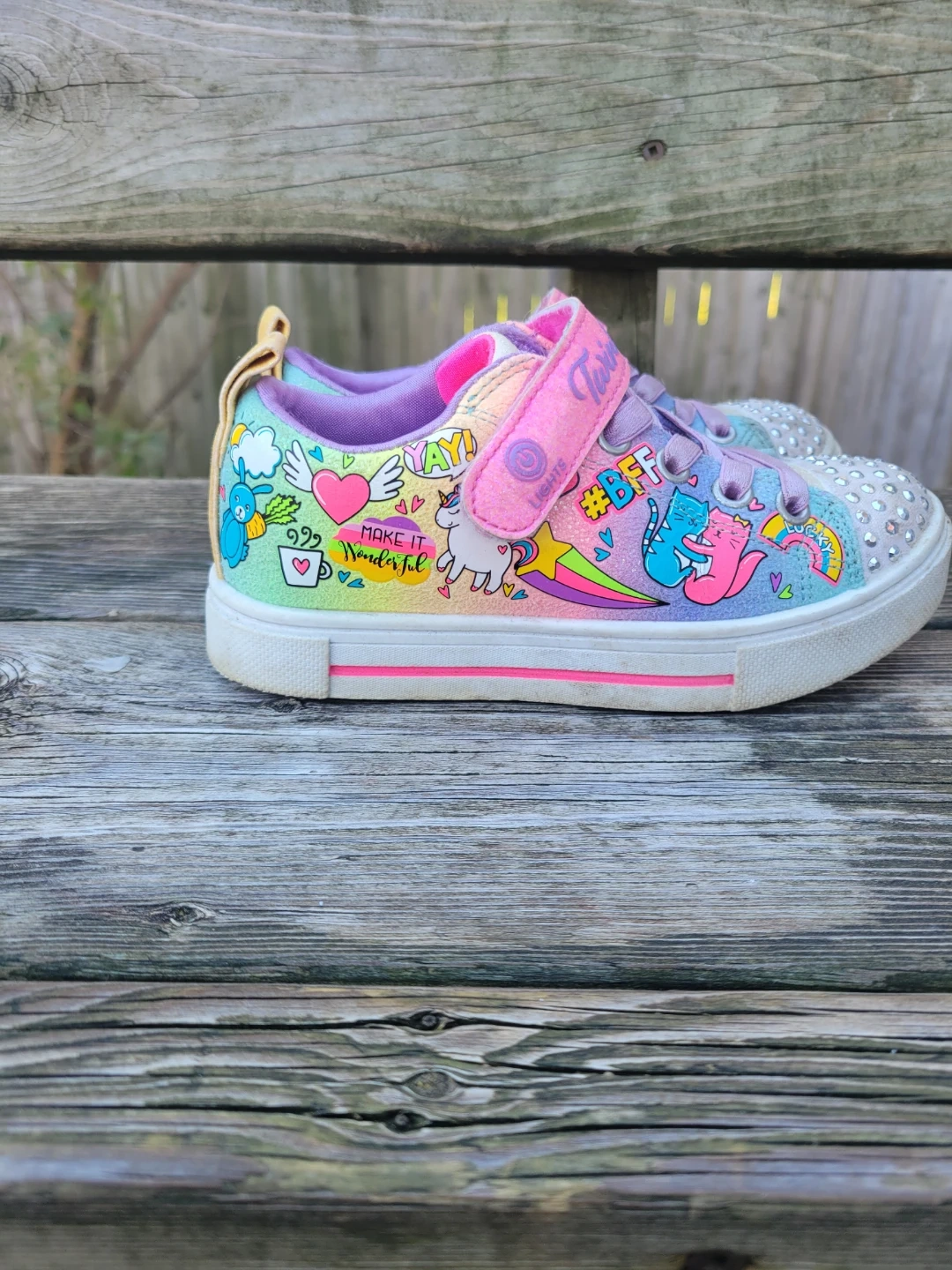 Selling a pair of Skechers Twinkle Toes sneakers in a size 11 girls! These are super cute and feature a colourful design with unicorns, rainbows, and lots of sparkle