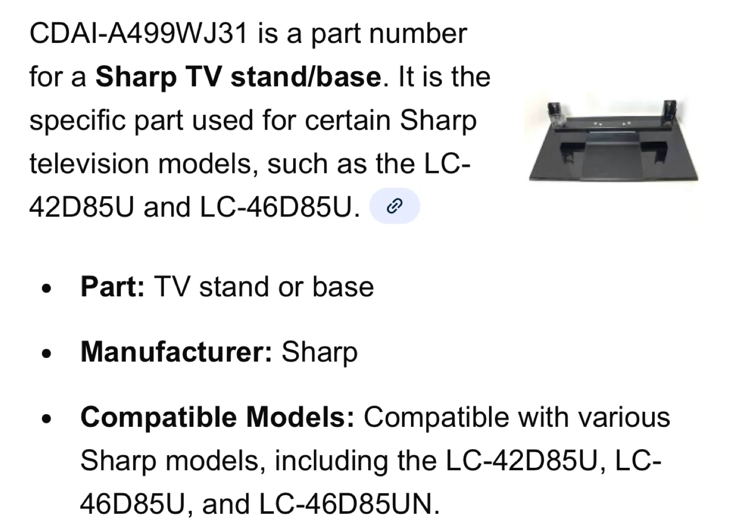 240Selling a Sharp TV stand/base with part number CDAI-A499WJ31. This stand is compatible with various Sharp TV models, including the LC-42D85U, LC-46D85U, and LC-46D85UN. It's in its original box and ready to go!