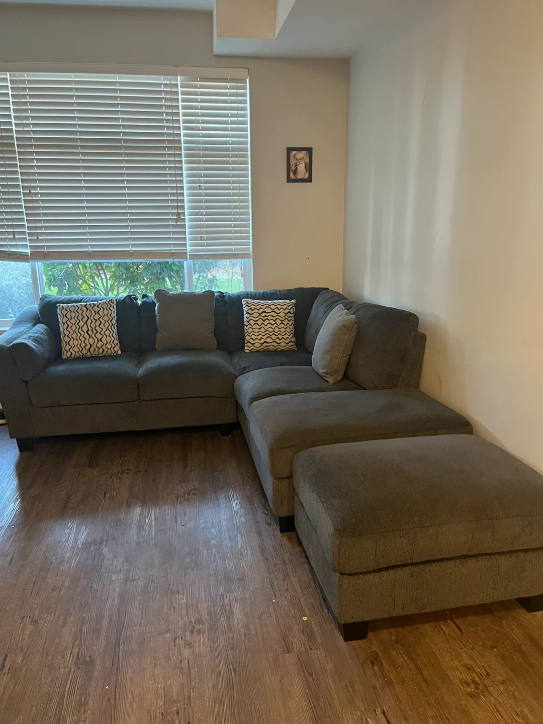 Selling a comfy grey sectional sofa that comes with an ottoman! It's in great shape and would be perfect for a living room or entertainment area with 4 cushions