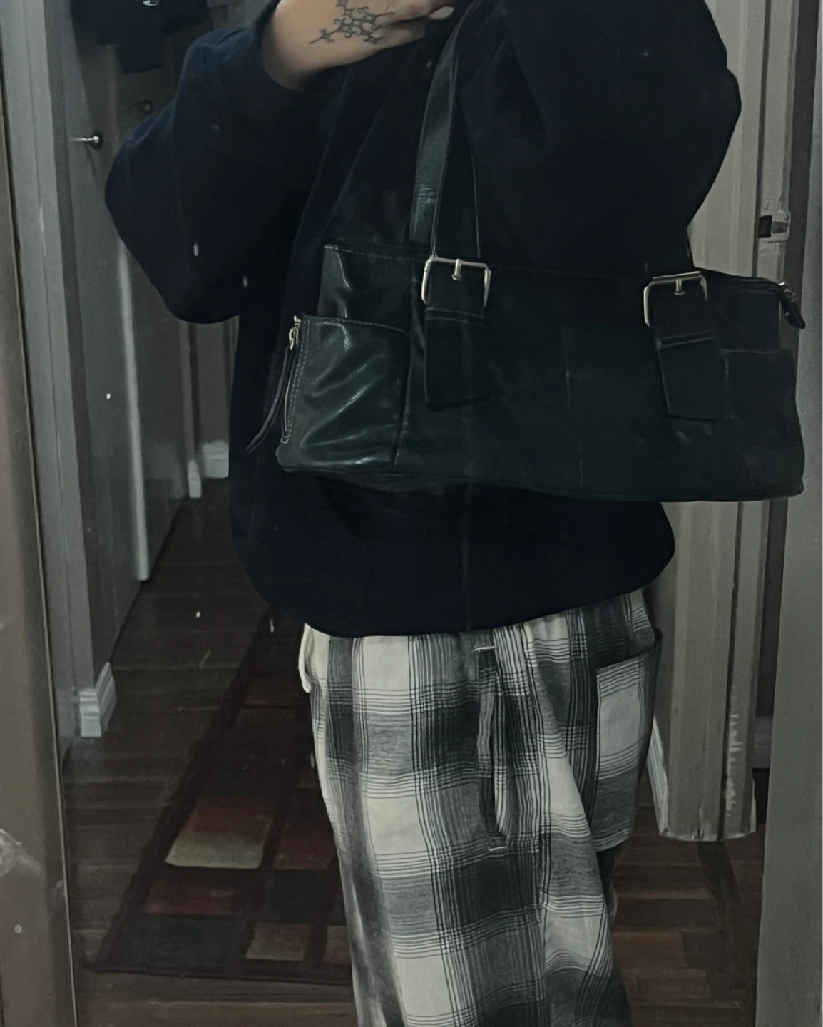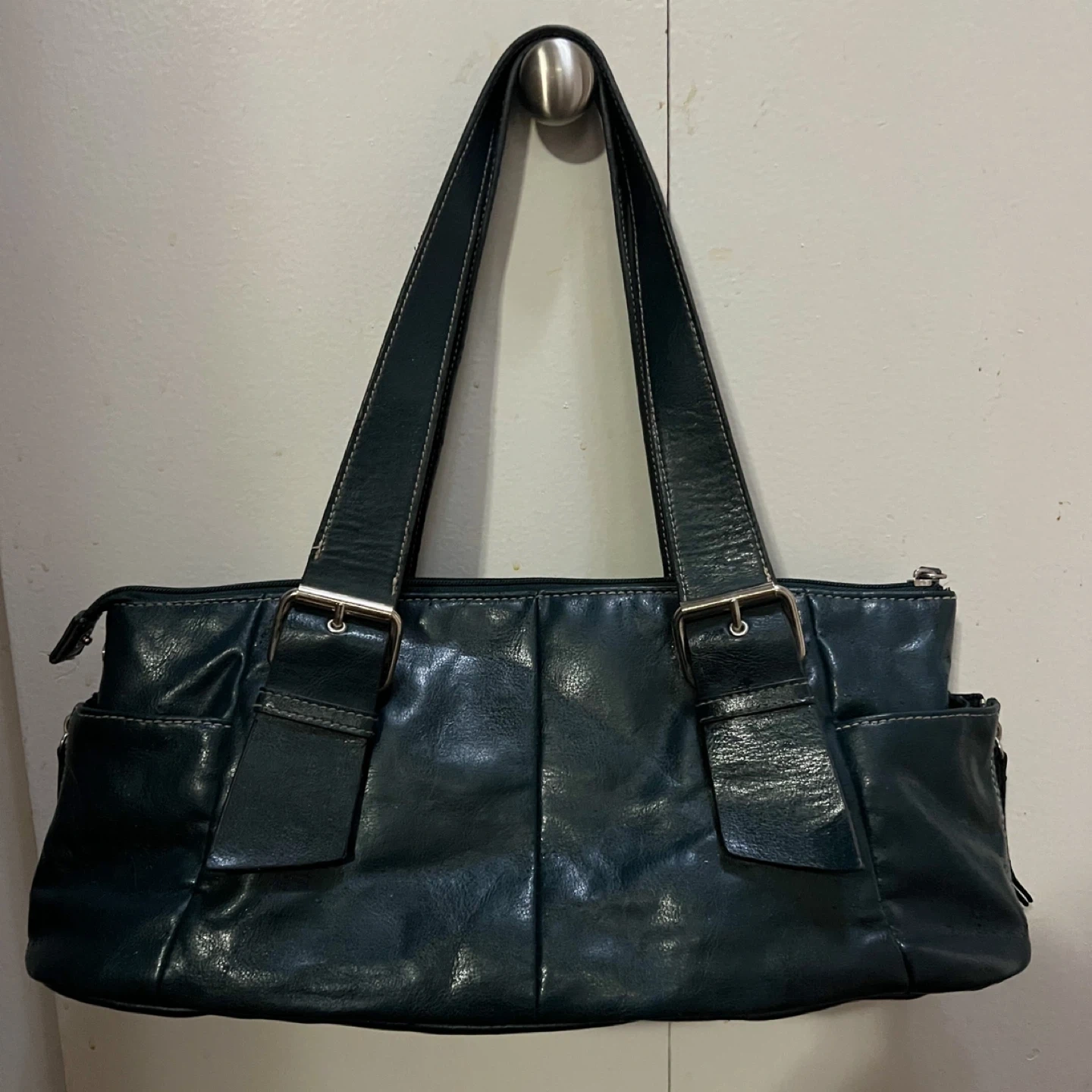 A unique teal colour. Pictures show the bag in different lighting. Very spacious on the inside and even fits a water bottle. No stains. Has slight peeling but not super noticeably. Did my best to clean without damaging the leather