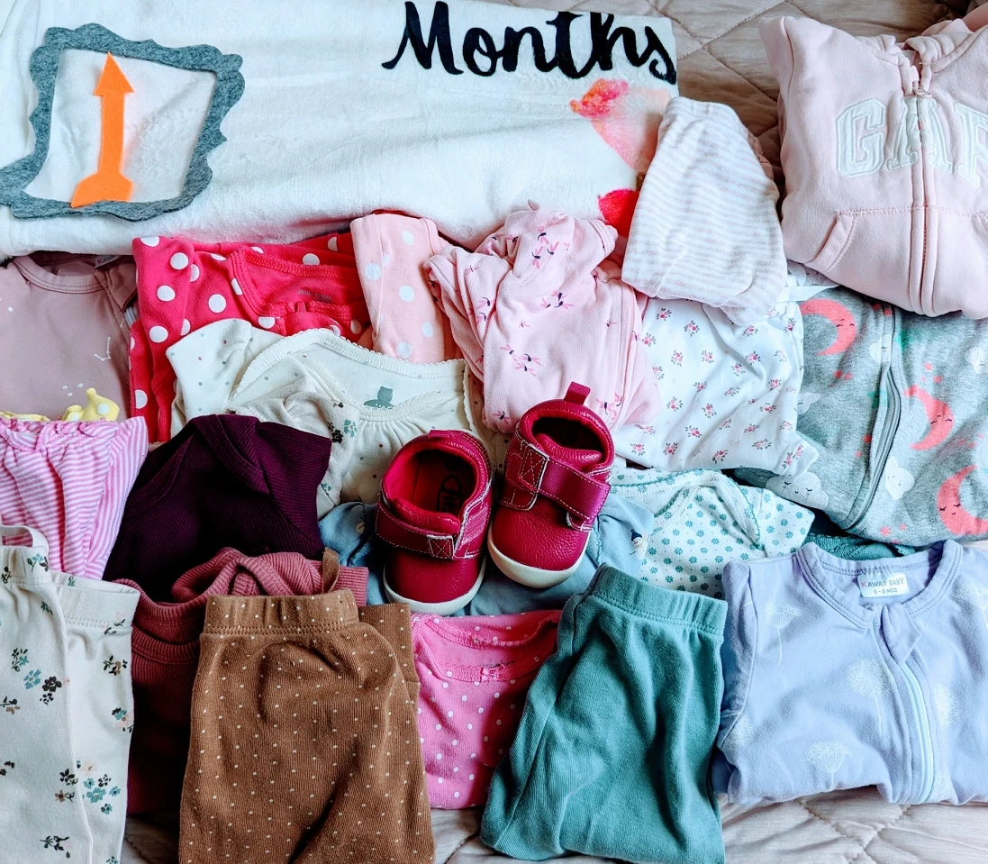Brand name baby clothes. More than 60 pieces including pants, bodysuits (short and long sleeved), pijamas, one pair of walking shoes size 19, a blanket for pics.