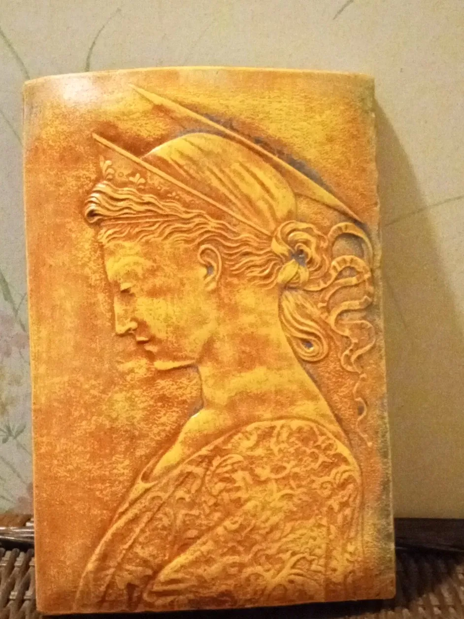 A unique piece of wall art featuring a woman's profile in a textured, golden hue. This decorative item would add a touch of classic elegance to any room