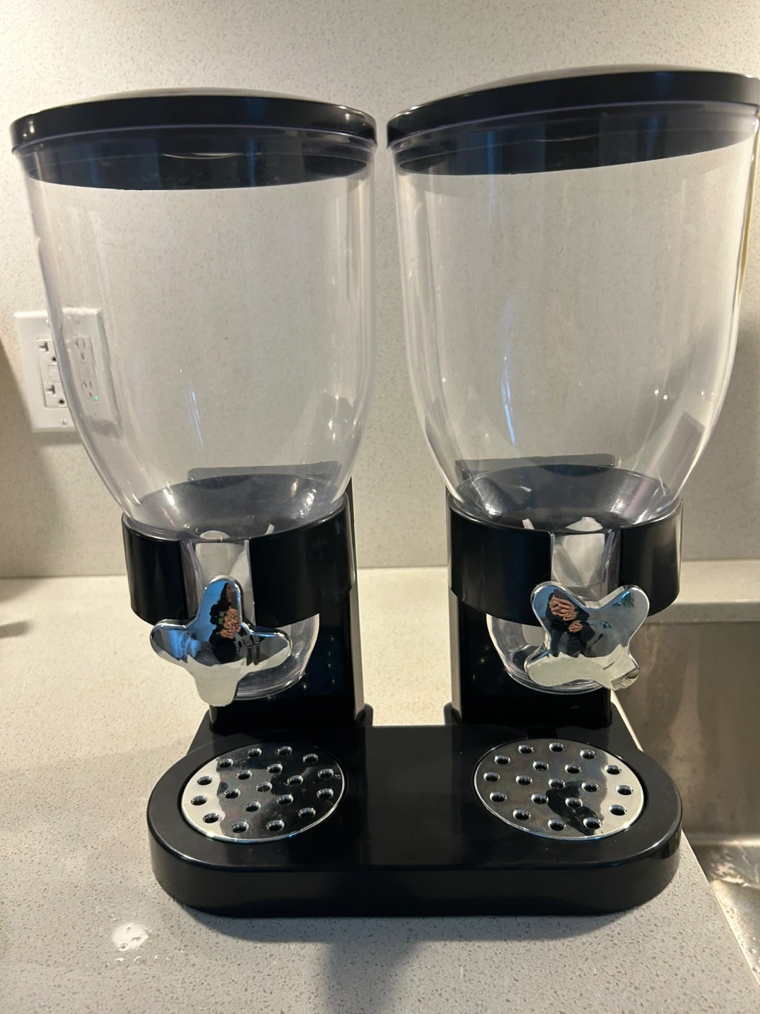 144Selling a double cereal dispenser in great condition! It's perfect for keeping your cereal fresh and easily accessible.
