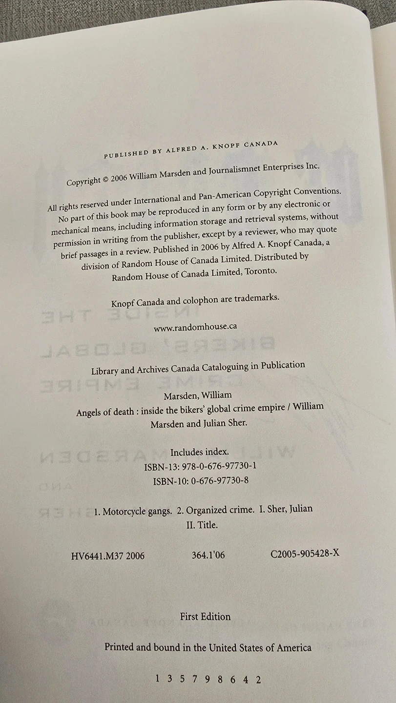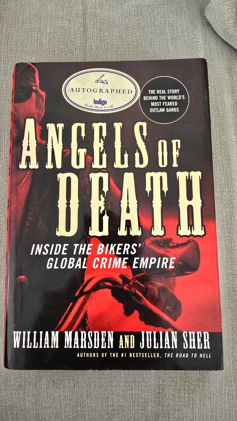 Selling a copy of 'Angels of Death: Inside the Bikers' Global Crime Empire' by William Marsden and Julian Sher. This book delves into the world of outlaw motorcycle gangs and their global reach. It's a gripping read for anyone interested in true crime and investigative journalism