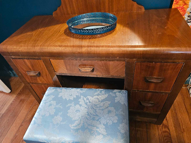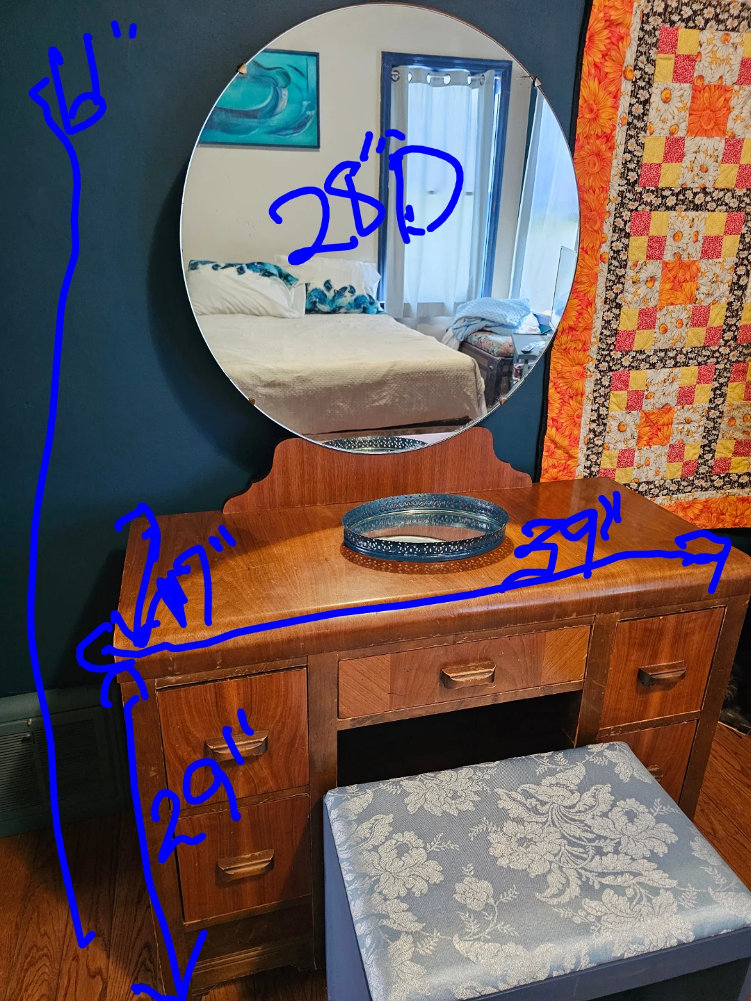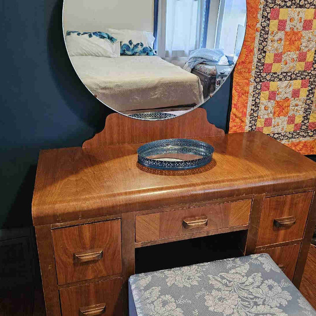This is an antique vanity with stool, offering a touch of vintage elegance and functionality, perfect as a bedroom accent piece. The vanity features a round mirror and comes with a matching stool. It's in good condition, bearing the marks of time which add to its unique charm. Features: - Round mirror - Matching stool - Multiple drawers for storage This vanity set, with its charming vintage appeal and practical design, is ready to find a new home. I've priced this one at a below market value for a quick sale. $100 is a great deal considering its condition and unique style. If the ad's still up, the vanity's still waiting for you!
