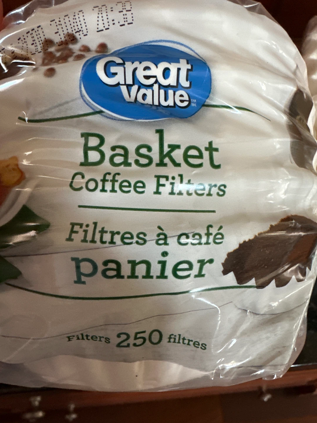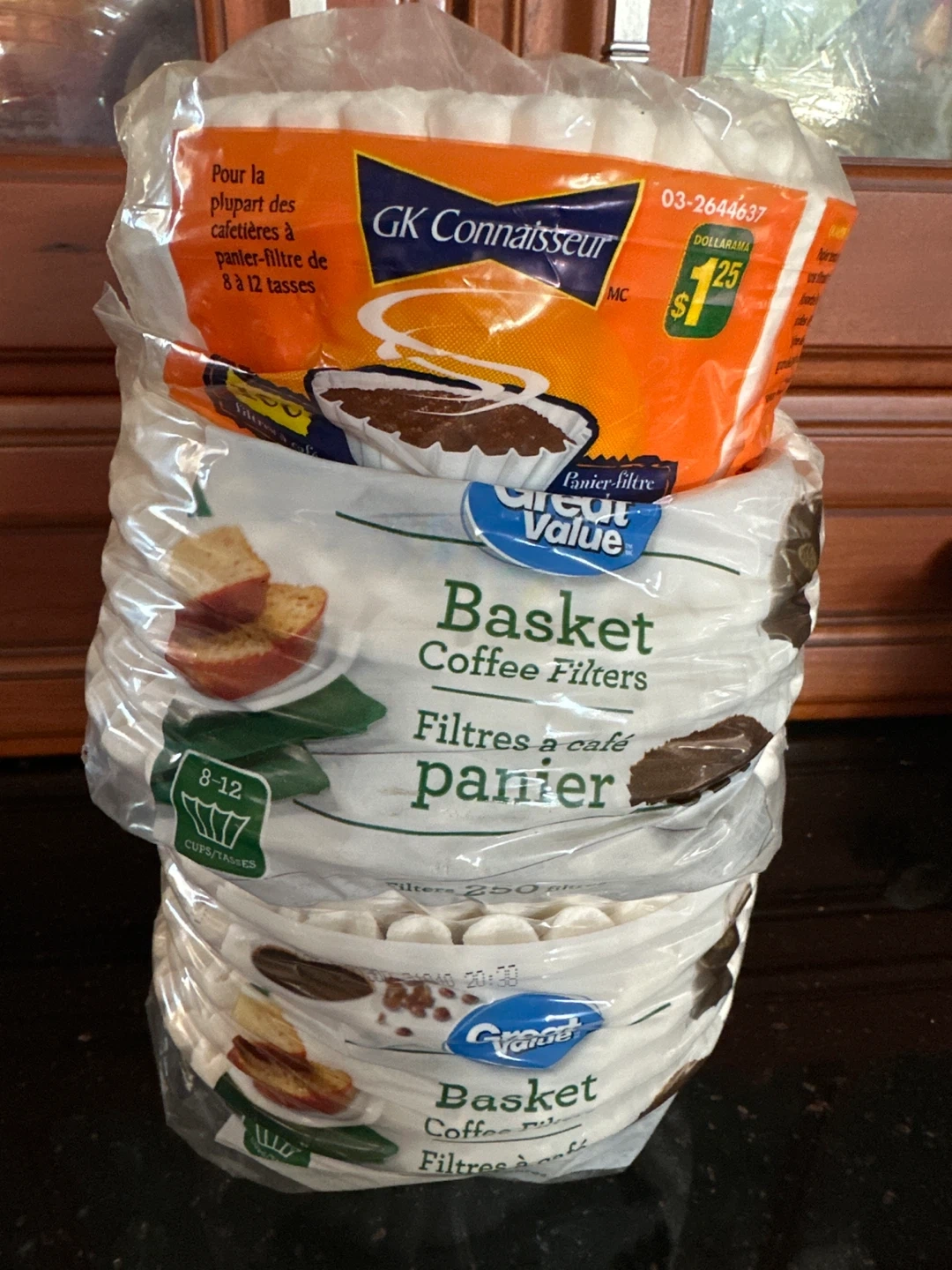 Selling a mix of GK Connaisseur and Great Value basket coffee filters. The GK Connaisseur package contains 100 filters, and the Great Value package contains 250 filters. Perfect for your morning coffee!