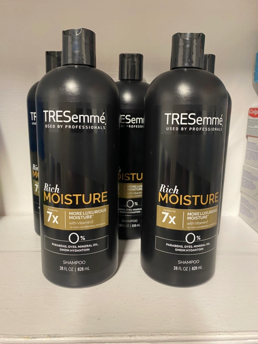 Selling a bottle of TRESemmé Rich Moisture shampoo. It's designed for more luxurious moisture with Vitamin E, and is free of parabens, dyes, and mineral oil. Each bottle contains 28 fl oz (828 mL).