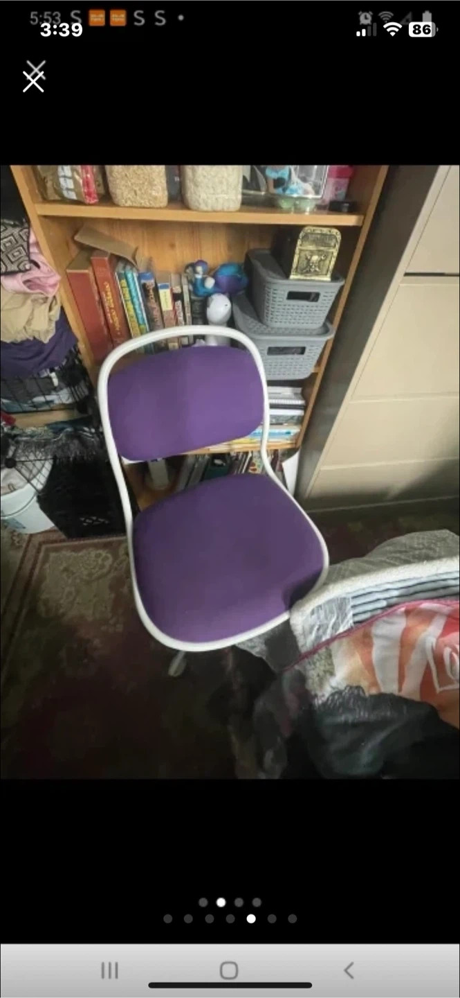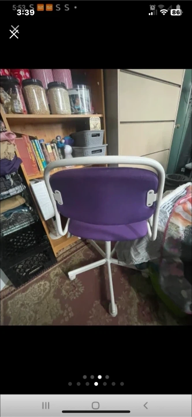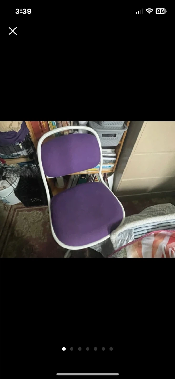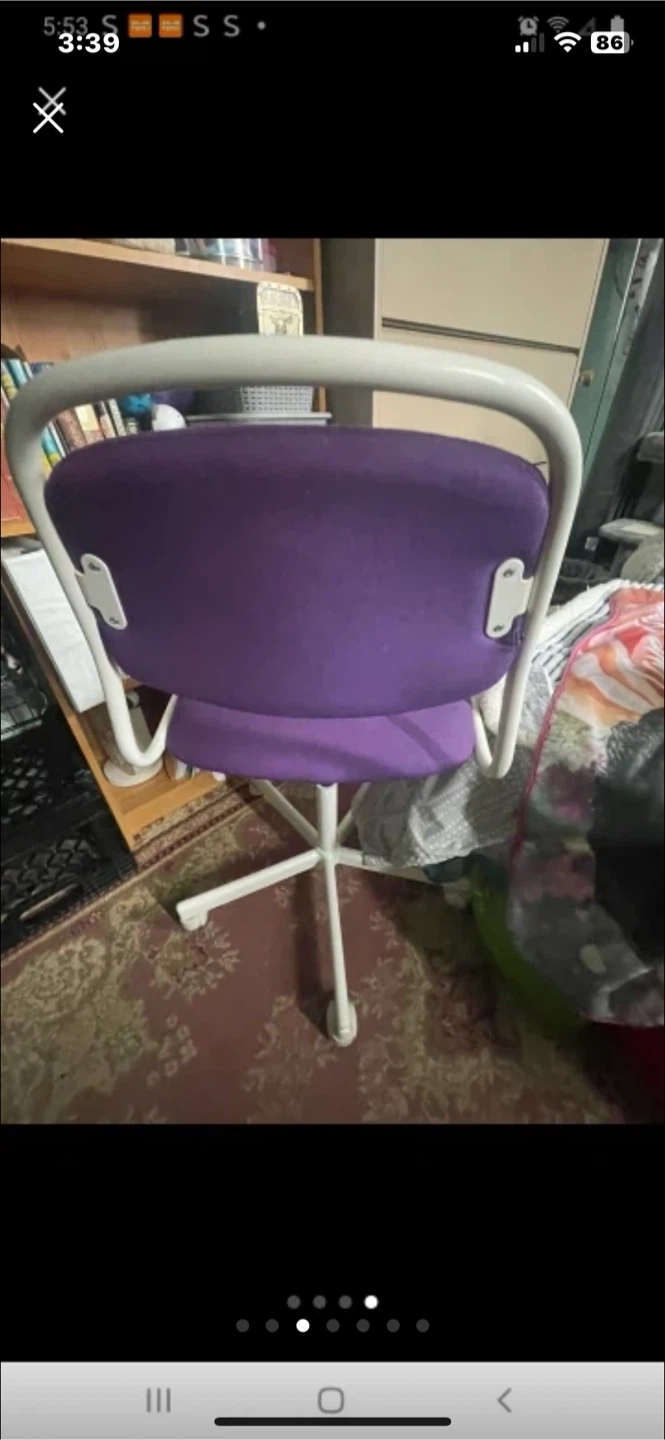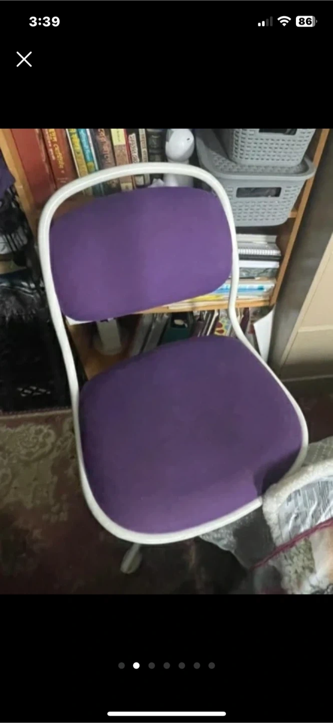 Selling a purple office chair! It's perfect for a home office or study space. The chair has a white frame and a comfortable seat. It is in good condition and ready for a new home! $20 pick up only Markham and Lawrence.