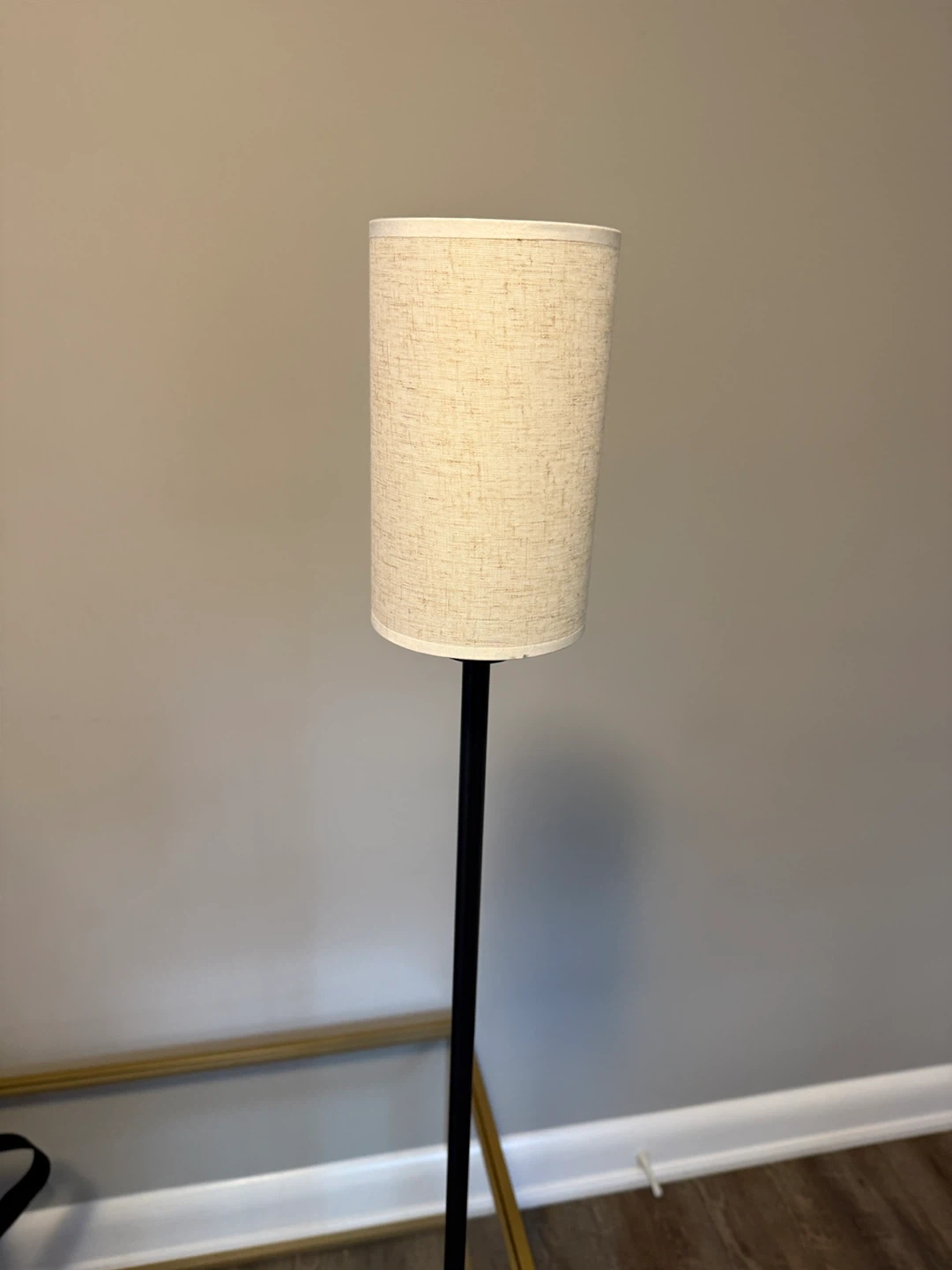 Selling a floor lamp with a beige fabric shade and a black metal stand. It has a simple, modern design that would look great in any room. The lamp is in good condition and provides a nice, warm light