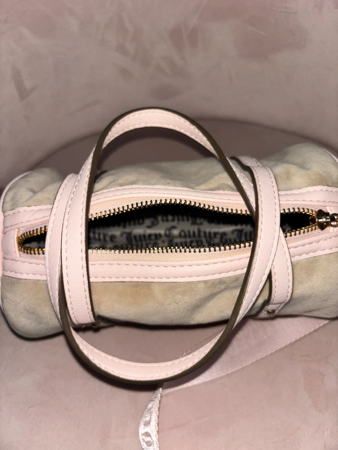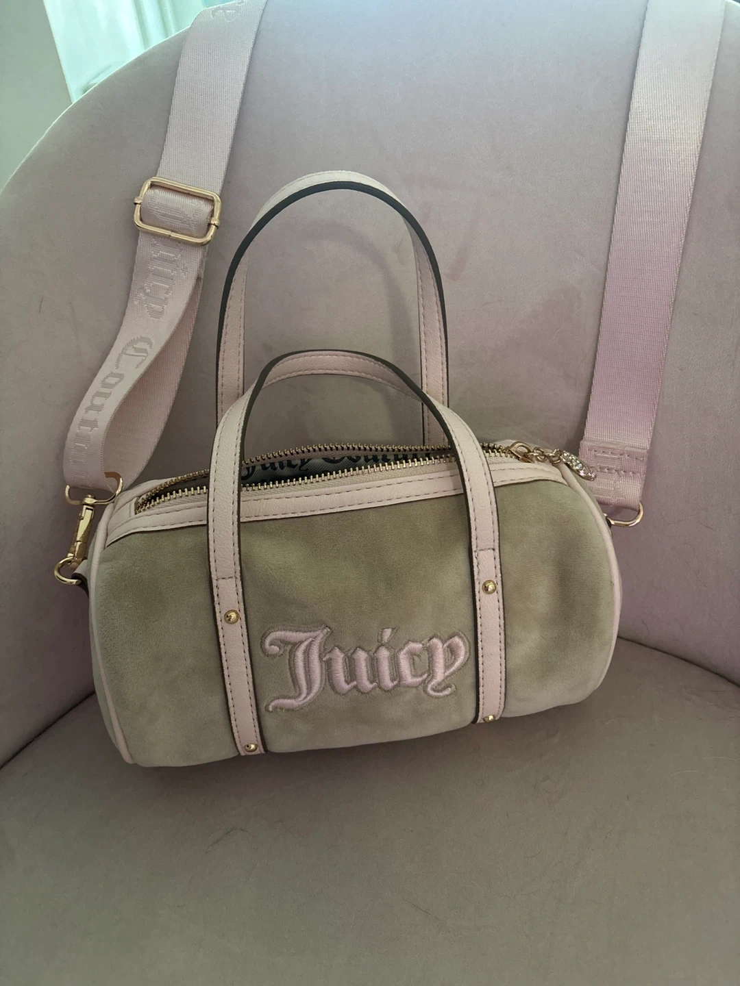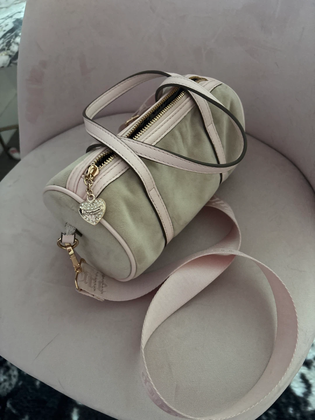 15Juicy Couture barrel bag 💕It features the classic Juicy logo embroidered on the front, and has a cute heart charm. The bag has both handles and a detachable shoulder strap.