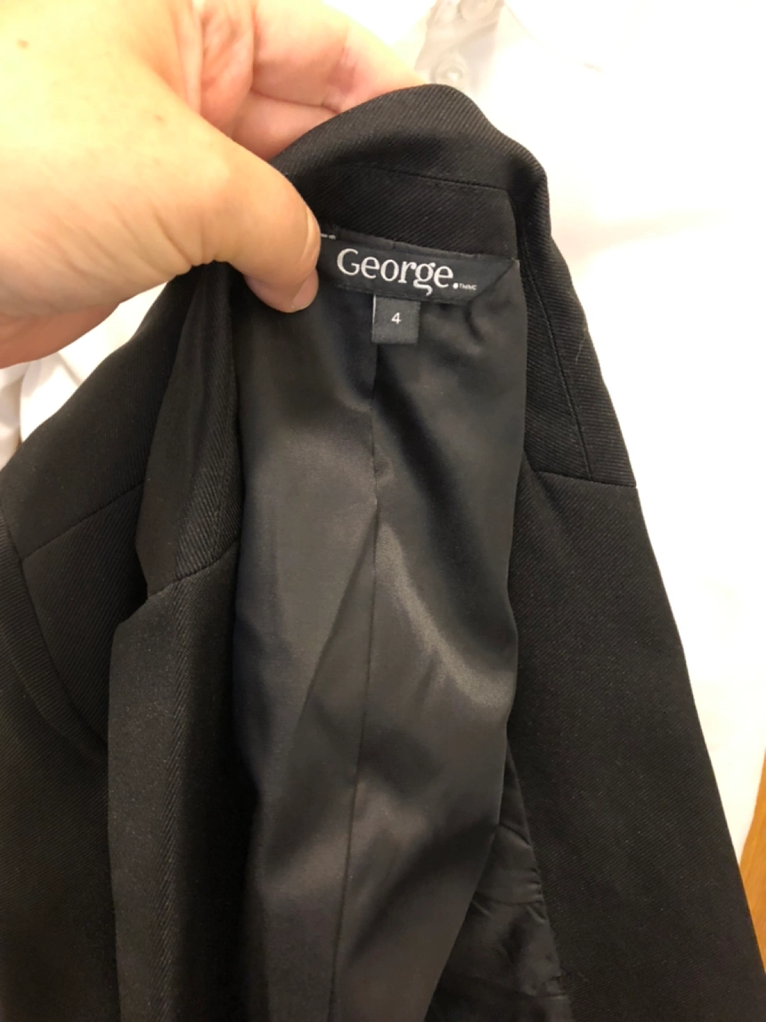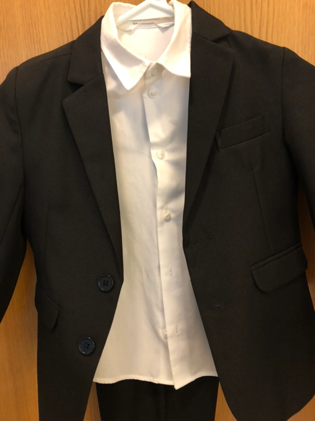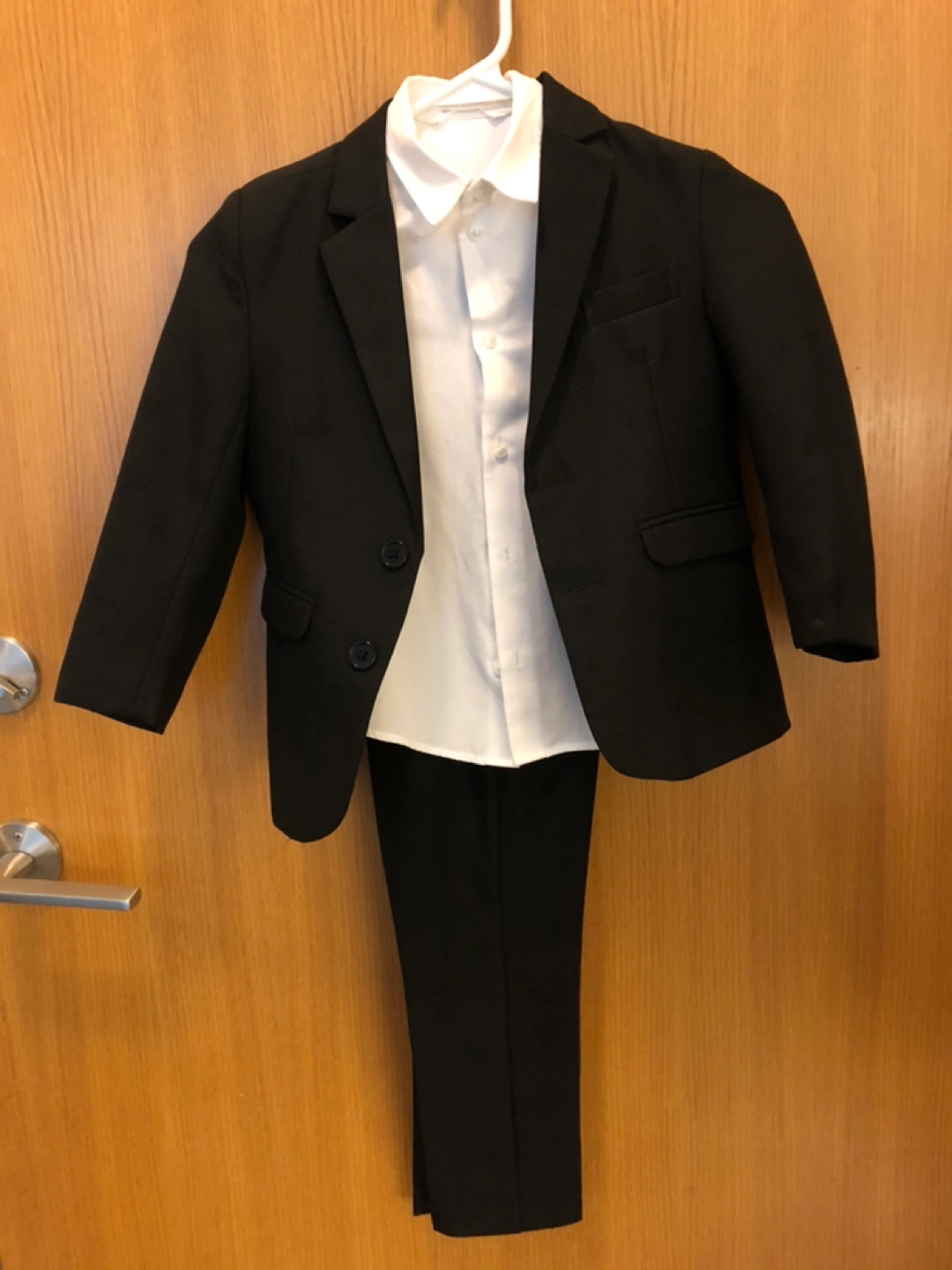 Like new boys suit in black. George brand suit, shirt is from H&M. Worn once for a wedding and now sadly outgrown. Paid $45 for suit. Paid $25 for the dress shirt.