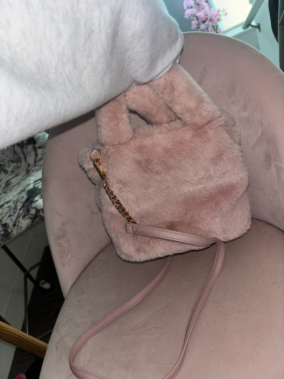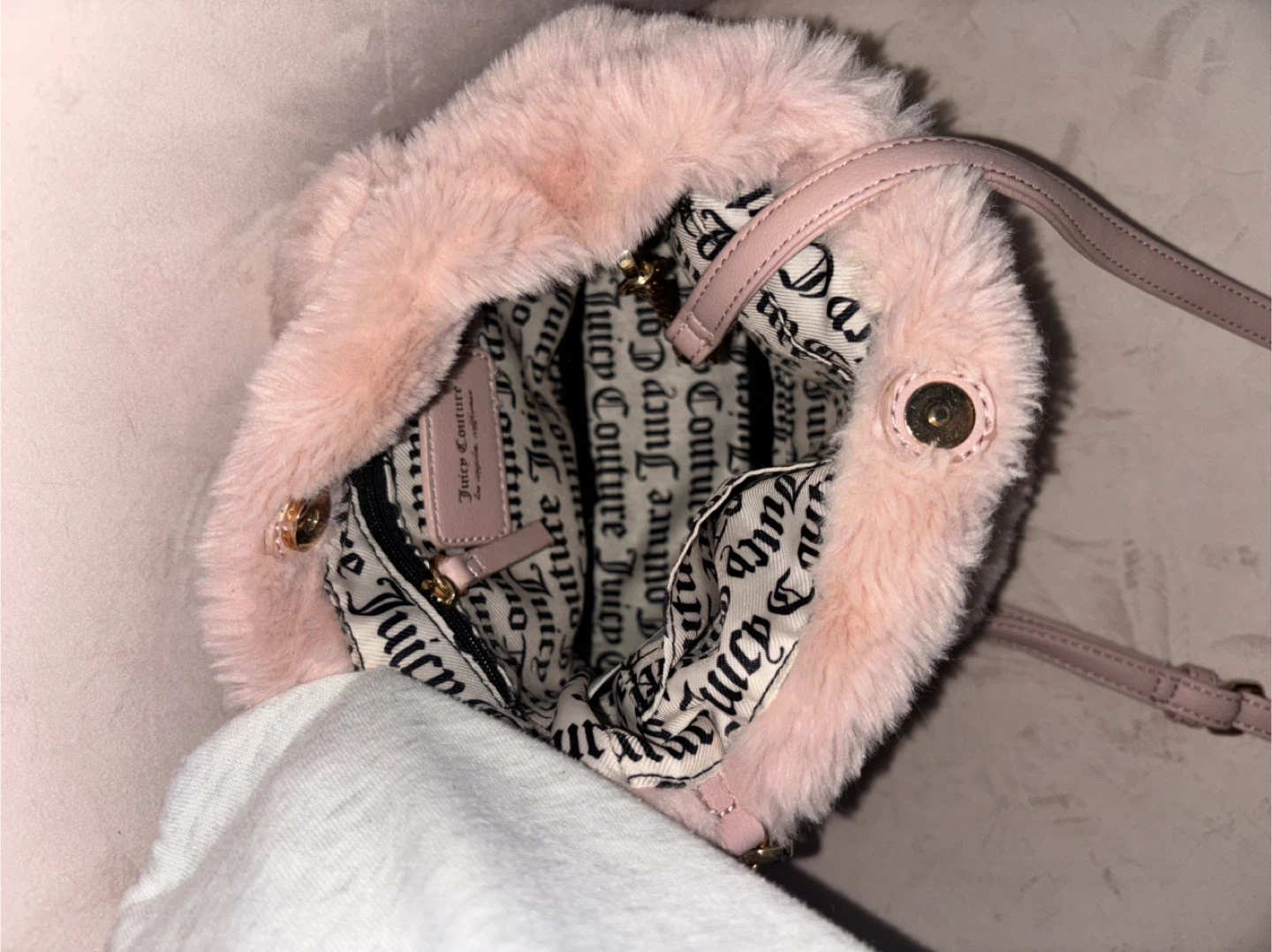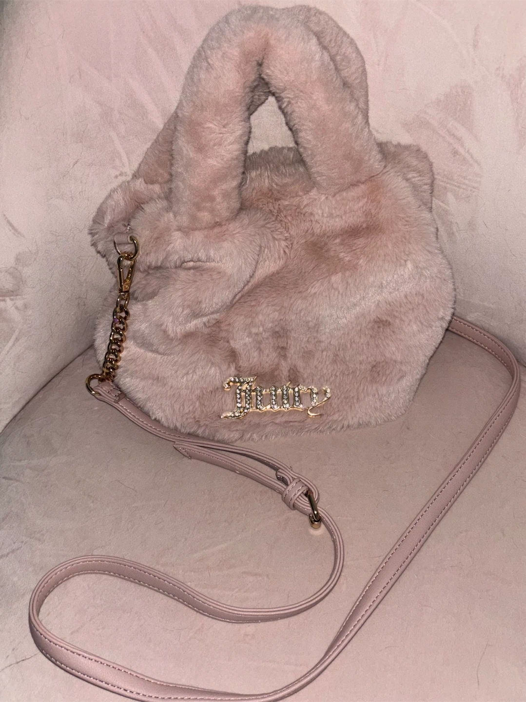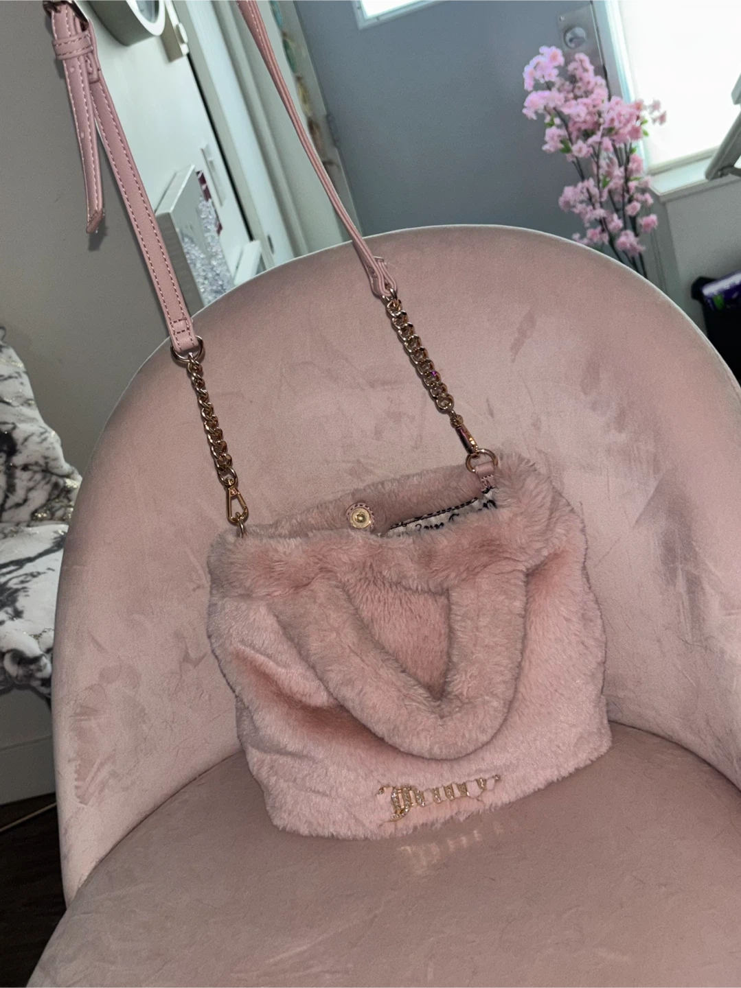 15Super cute Juicy Couture purse in a soft pink faux fur! It has a crossbody strap and a chain detail. The interior lining features the Juicy Couture logo. Good Condition