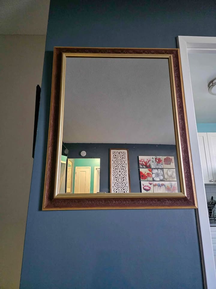 Add a touch of elegance to your space with this decorative gold and bronze framed wall mirror.