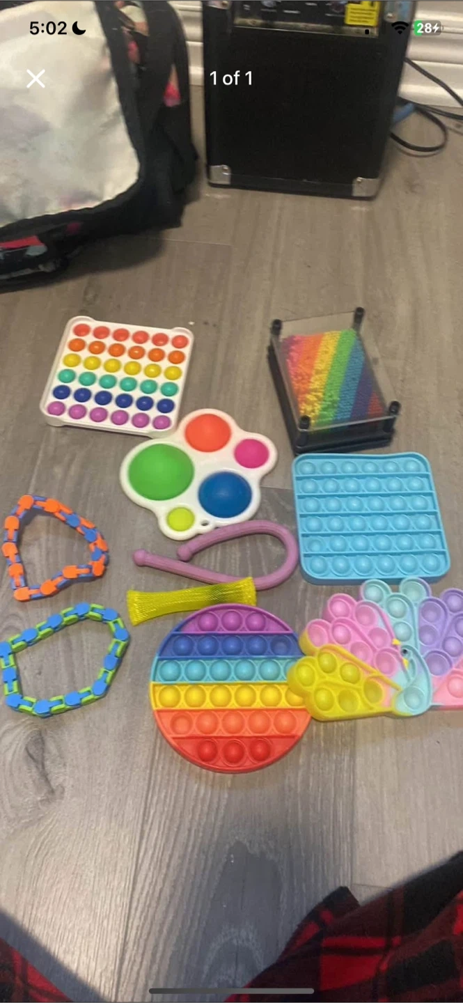 10Selling a bundle of various fidget toys! Includes a rainbow pop-it, a dimpl, a rainbow bead maze, a blue square pop-it, two fidget bracelets, a noodle stretch toy, and a peacock pop-it. Great for stress relief and sensory play!