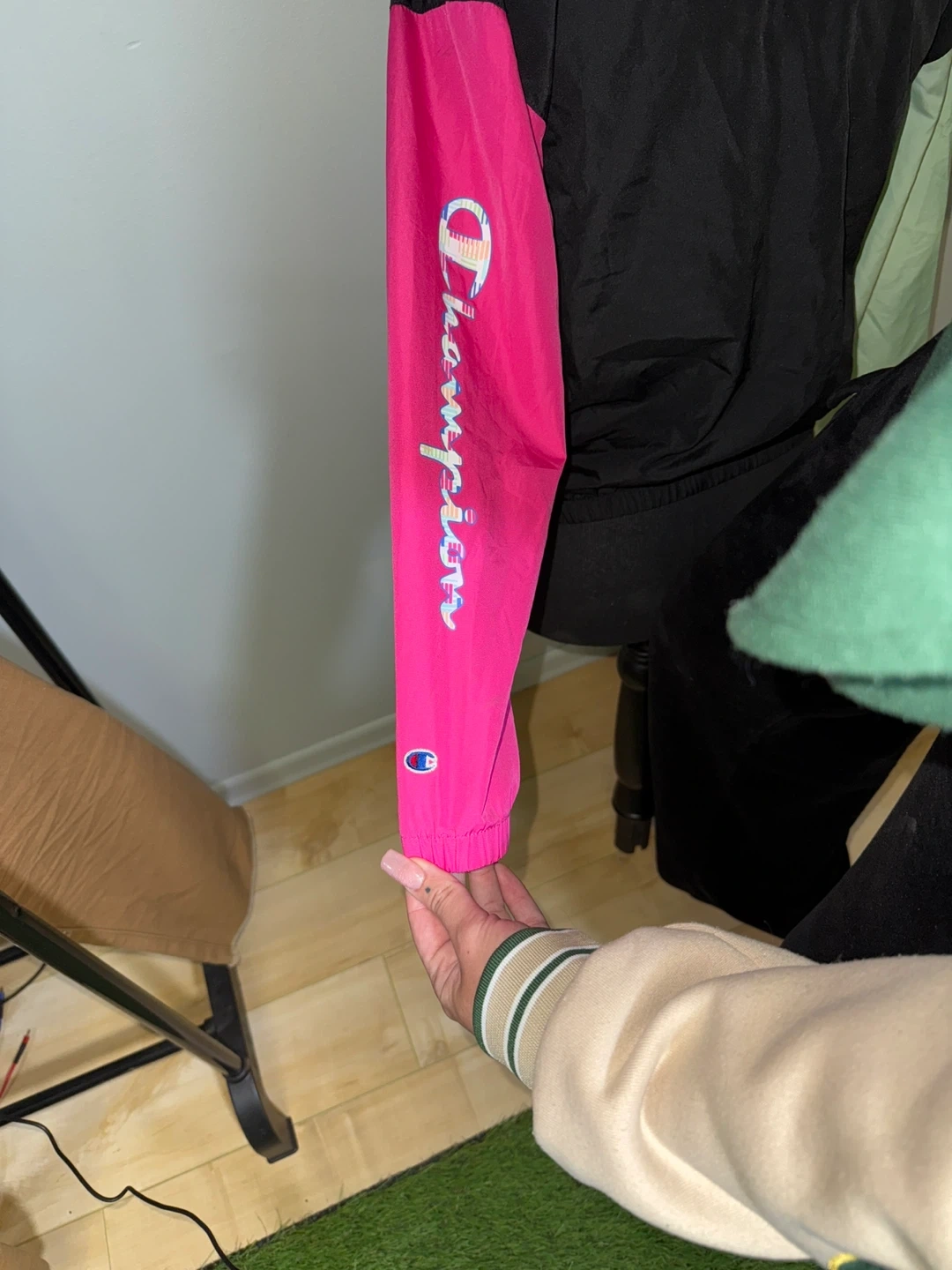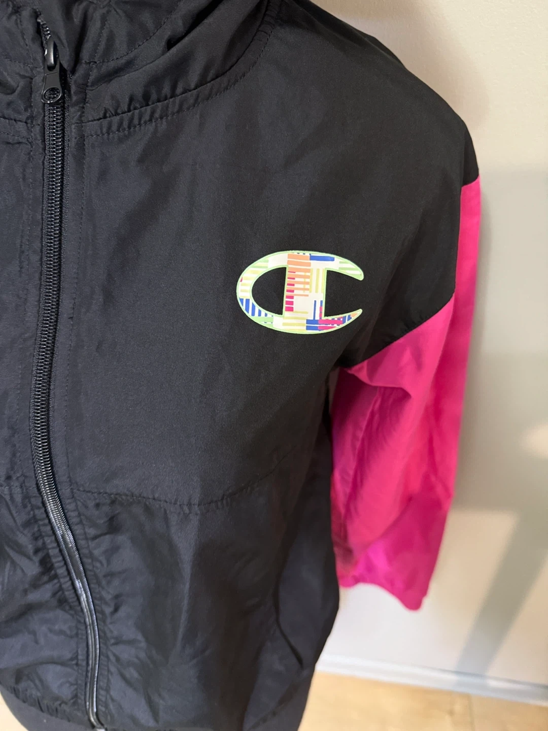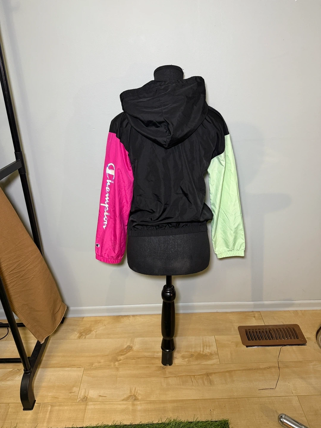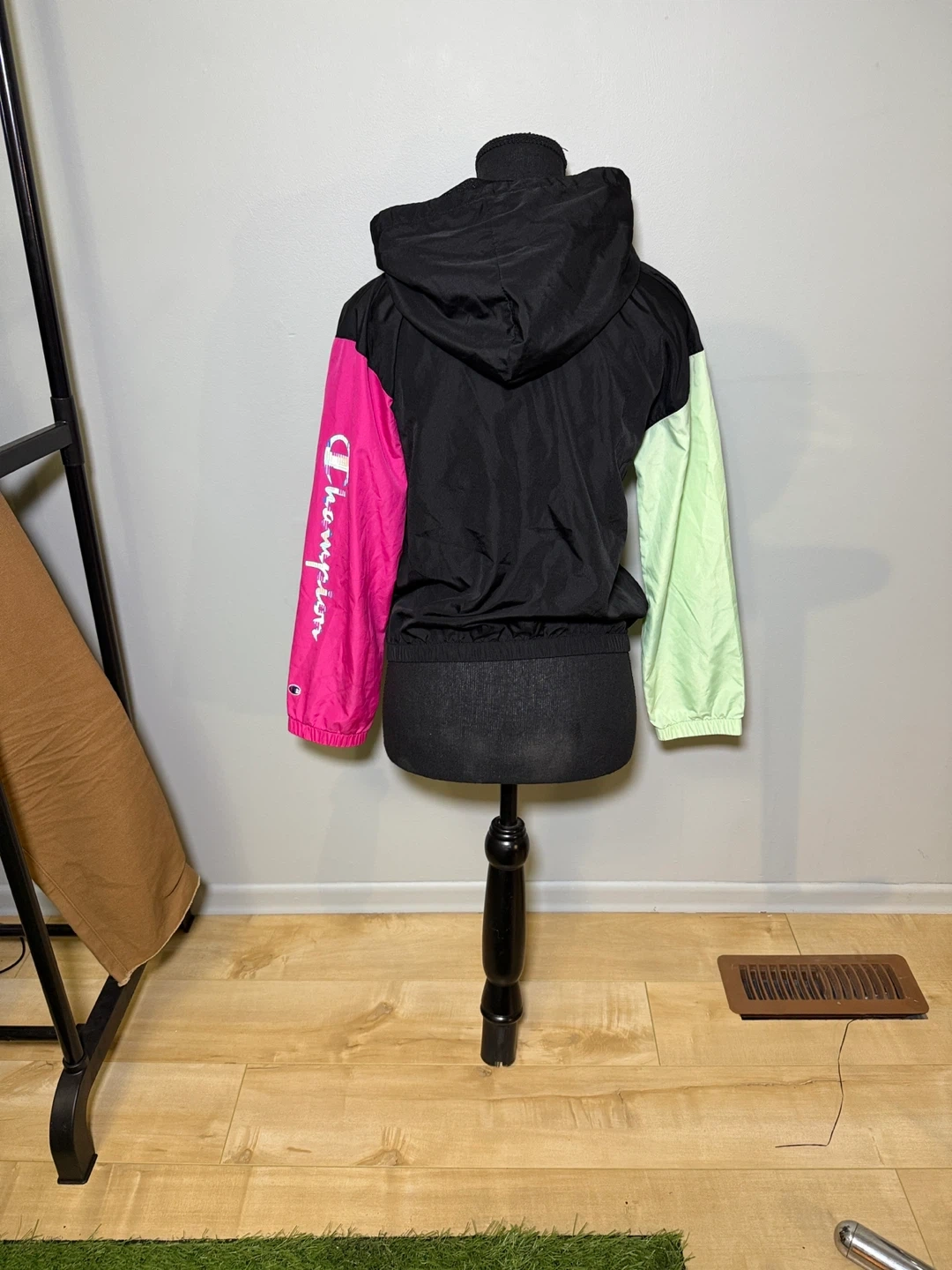 72Selling a Champion windbreaker jacket in a fun colour block design! The jacket features black, pink, and light green panels. It has the Champion logo on the front and down the pink sleeve. Perfect for layering on those breezy days L fits like a small