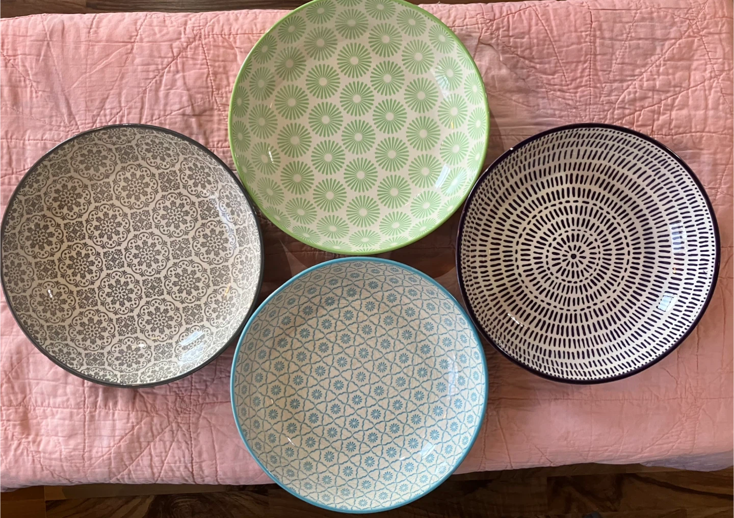 Selling a set of 4 decorative serving bowls. They feature unique patterns and colours. Perfect for adding a touch of style to your table! 3 bowls are Brand New - Purple, Green, Grey. Blue bowl (used)