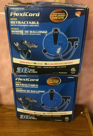 Brand New Flexicord Indoor Retractable Metal Extension Cord Reel. 30 feet. Medium Duty 16 Gauge. 10 Amp. 125 V. 1250 Watts. Two Available. $70 Each.