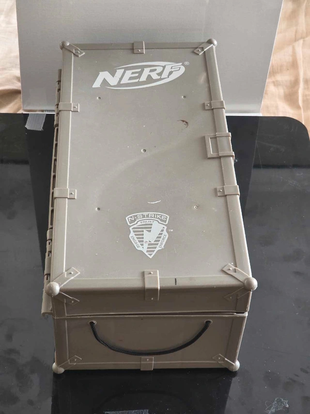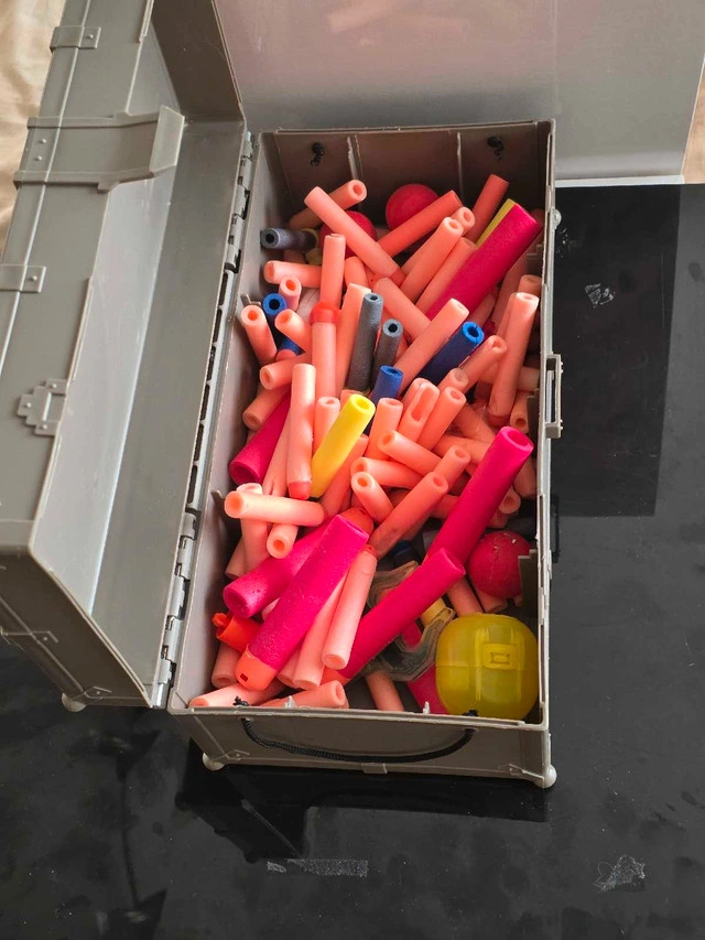 Get ready for Nerf battles with this used Nerf Elite case, packed with darts! This is the perfect way to store and transport your ammo, ensuring you're always prepared for action. This item has been used, so it does show some signs of wear, but it's still ready for lots of fun. * Holds a variety of Nerf darts. * Durable construction for on-the-go play. Remember, if you see this ad, the Nerf case is still available, ready to bring joy and order to your Nerf arsenal.