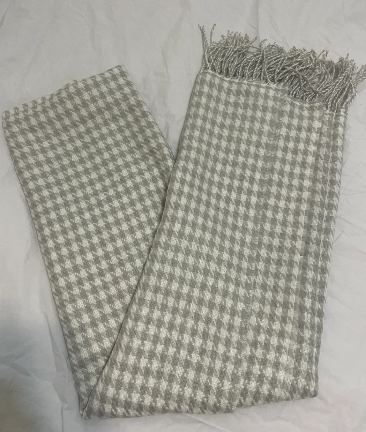 A cozy houndstooth scarf in grey and white! It's perfect for adding a touch of style and warmth to any outfit. The material is soft and comfortable, making it ideal for chilly days. It's in great condition and ready for a new home