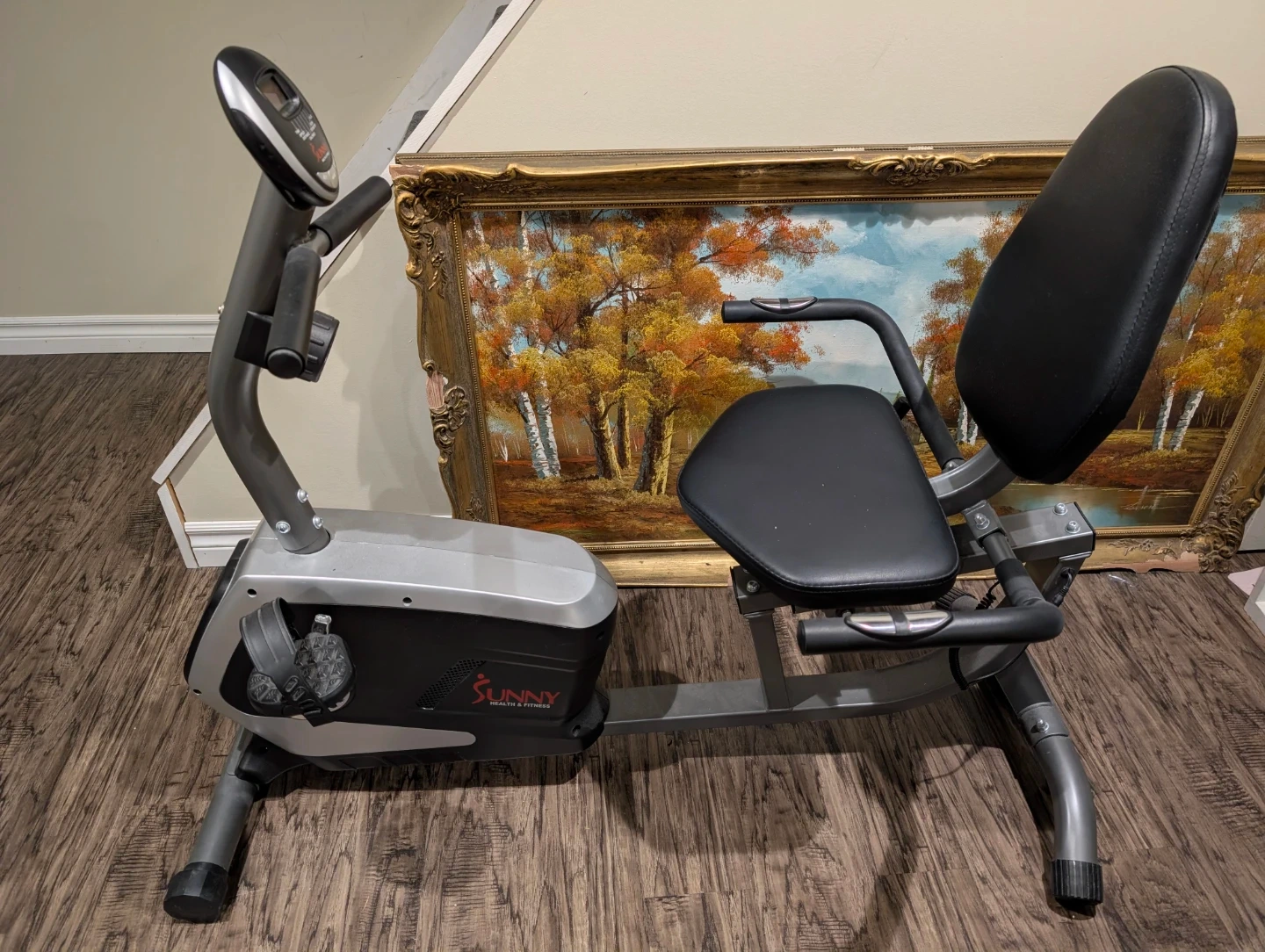 Selling a Sunny Health & Fitness recumbent bike. It's in great shape and ready for a new home. The bike features a display that tracks time, speed, distance, calories, pulse, and odometer. Perfect for getting a workout in at home!
