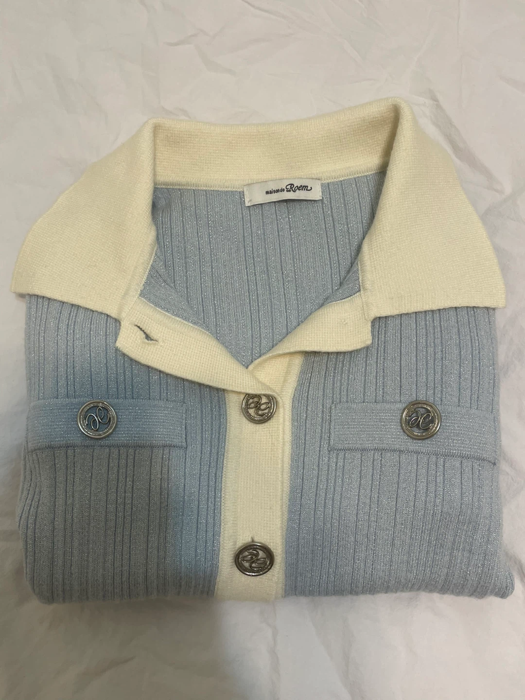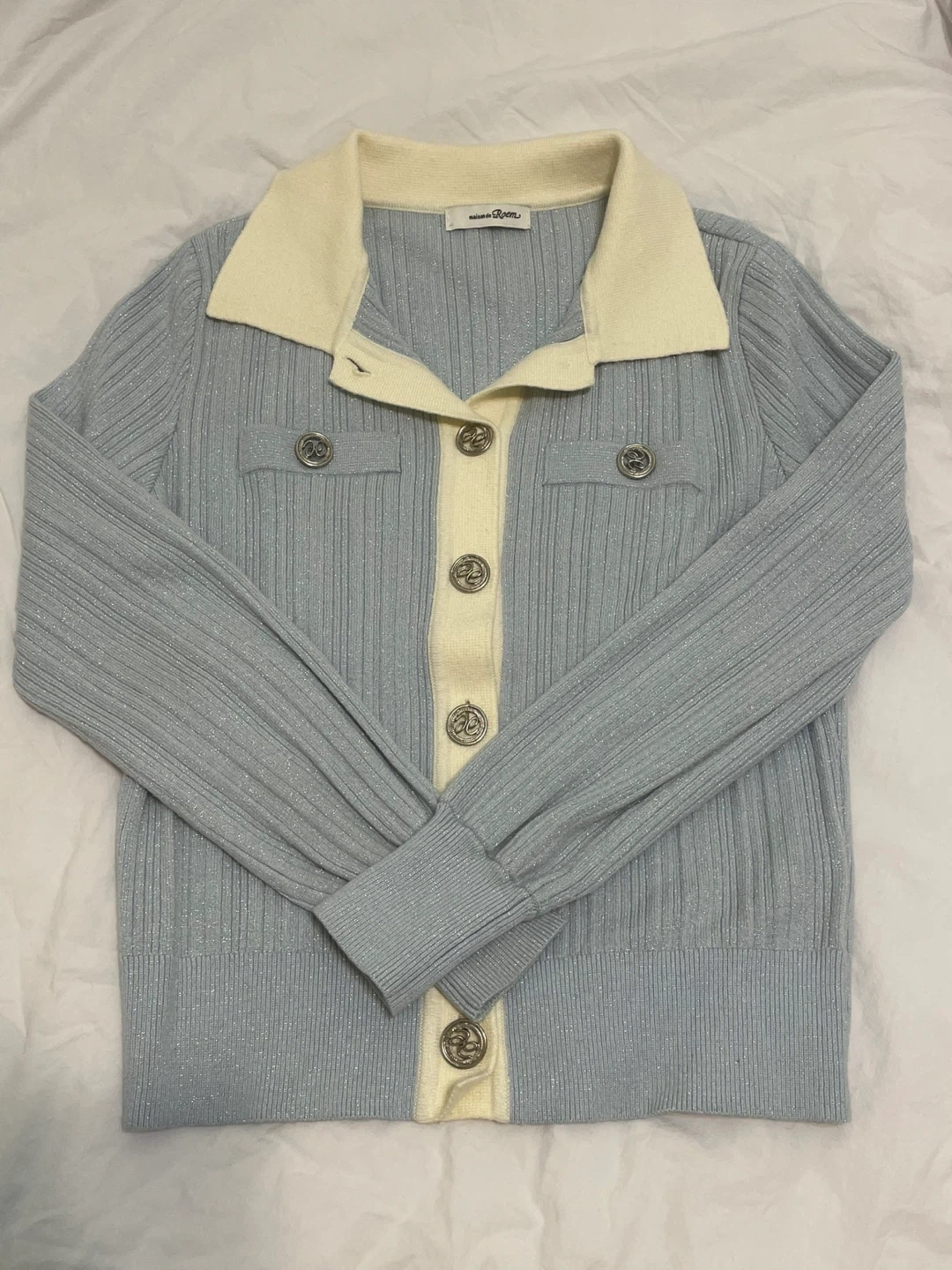 Cute maison de Roem cardigan in a lovely blue and cream colour! It's in great condition and ready for a new home! Perfect for layering or wearing on its own.
