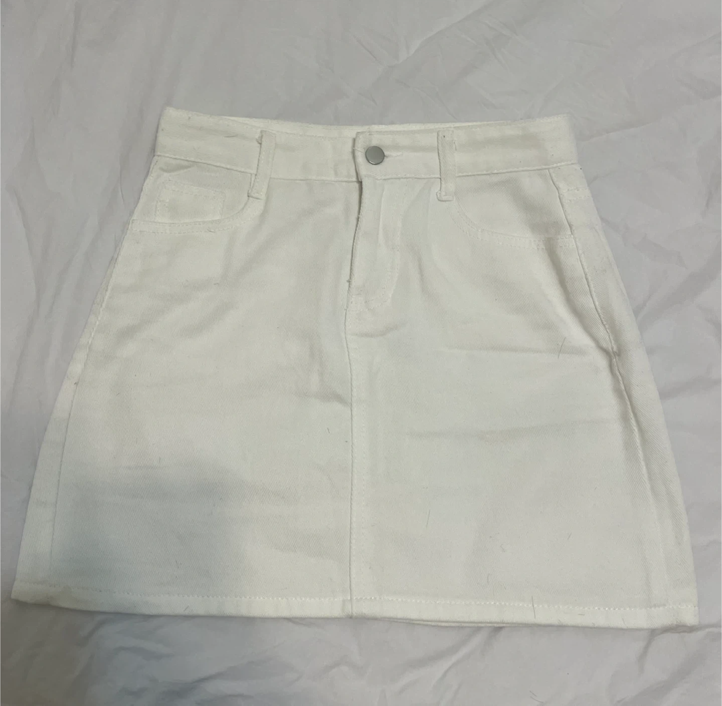 Selling a cute white denim mini skirt! It's in great condition and perfect for a casual outing. The material is comfortable and the style is versatile, making it a great addition to any wardrobe
