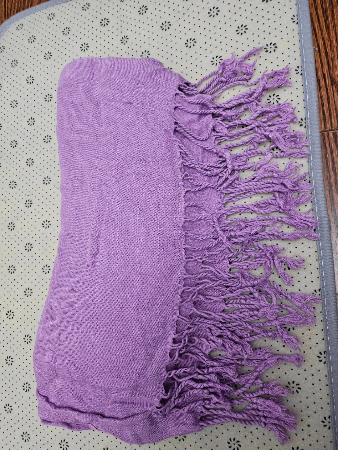 1000+This is a lovely pashmina scarf made of 100% cashmere. It's a beautiful purple colour and would be perfect for adding a touch of elegance to any outfit. It's in great condition and ready for a new home