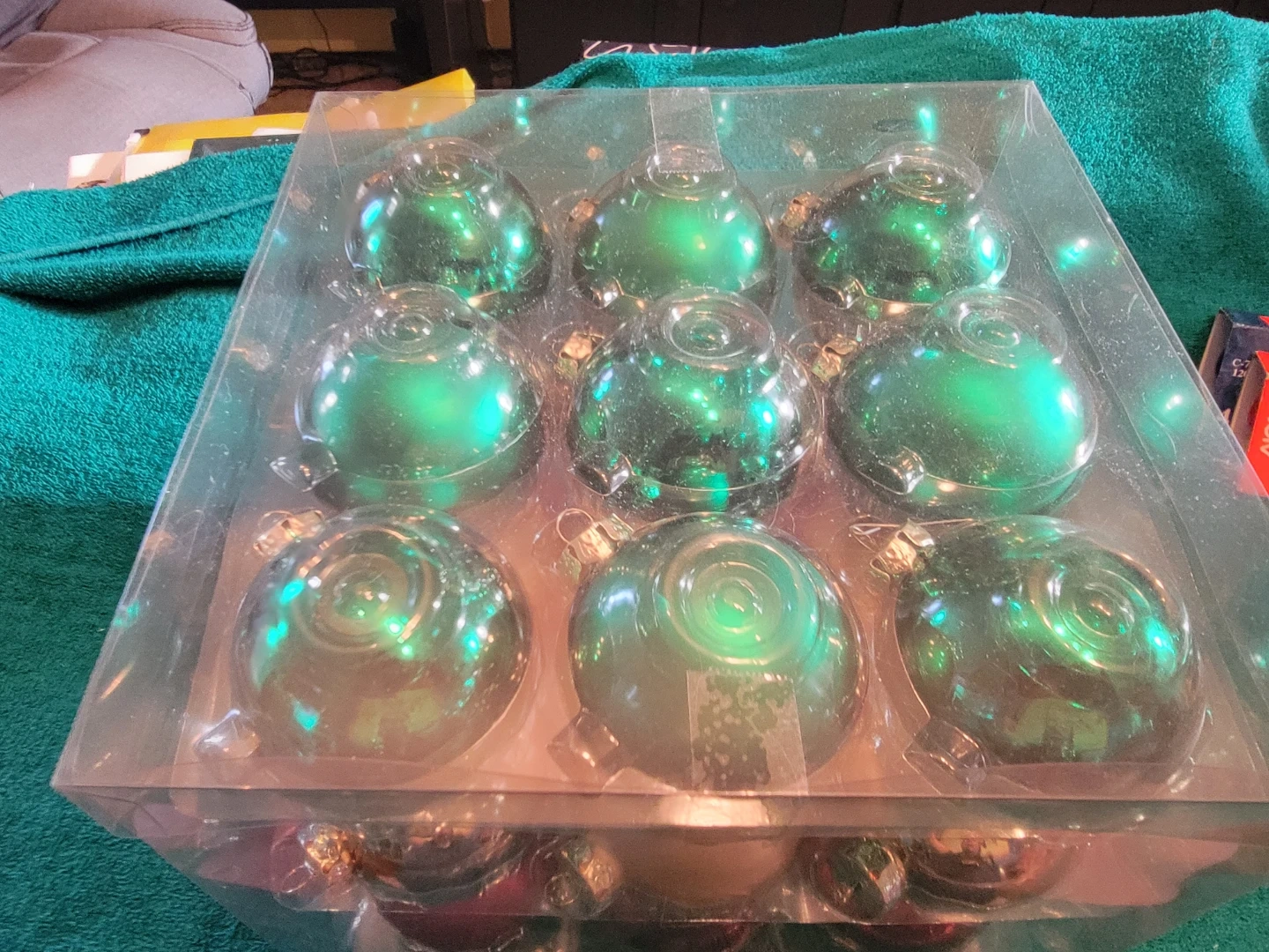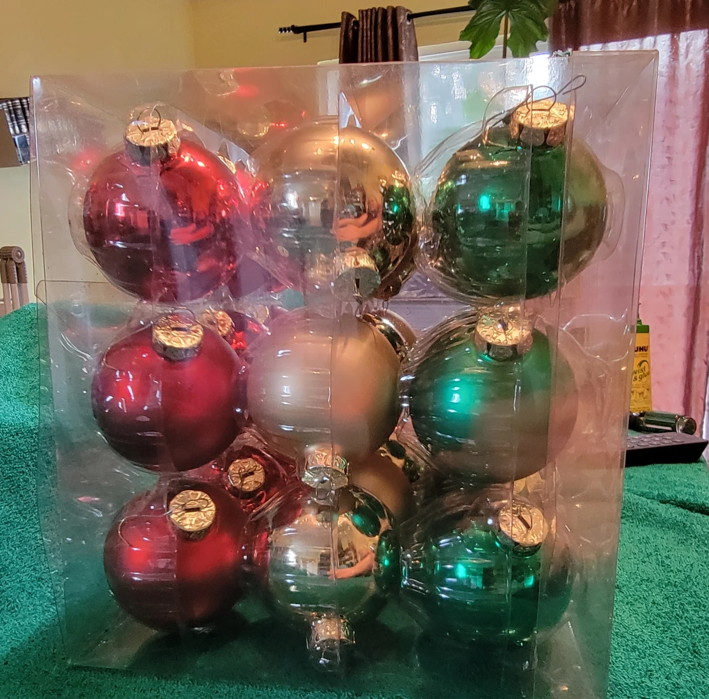 Selling a set of 27 like new plastic Christmas ornaments. Includes red, gold, and green colours. They are still in the original packaging.