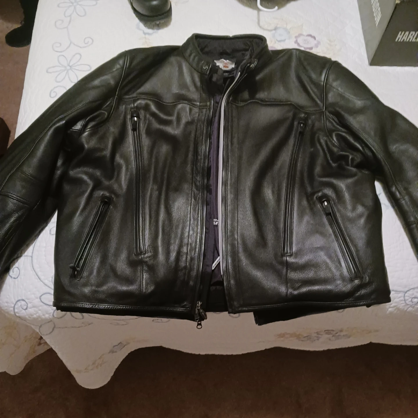Selling a Harley-Davidson leather jacket in size 3xl. It's a classic black leather jacket with the iconic Harley-Davidson logo. The jacket is made of 100% polyester for the lining and cover. This jacket is perfect for any Harley enthusiast!