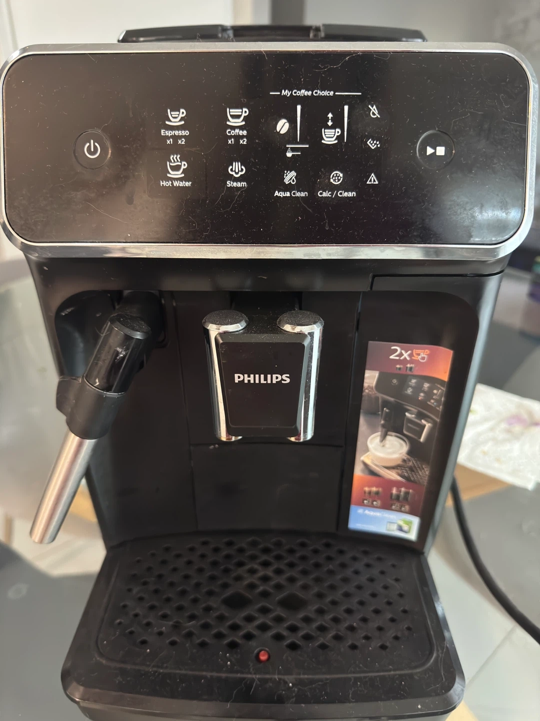 Selling a Philips espresso machine. It can make espresso, coffee, hot water and steam. It also has aqua clean and calc/clean functions.
