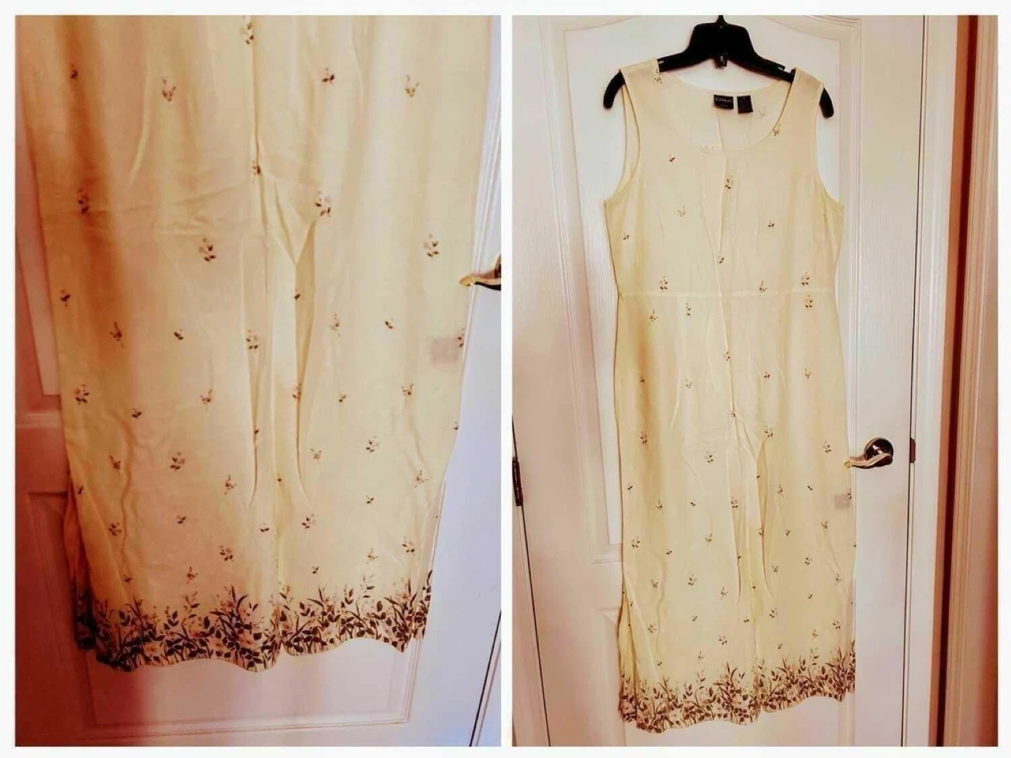 Size medium. Bust is about 38. Length from shoulder to hem is 51 inches. There’s a slit on one side of skirt, from knee to hem