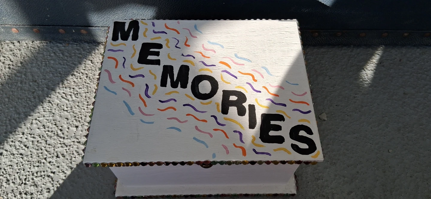 This charming white keepsake box is hand-painted with the word "Memories" and colourful wavy lines. It features a decorative clasp and colourful gem accents along the lid and base. It's perfect for storing small treasures and sentimental items. A lovely way to keep your most cherished mementos safe!
