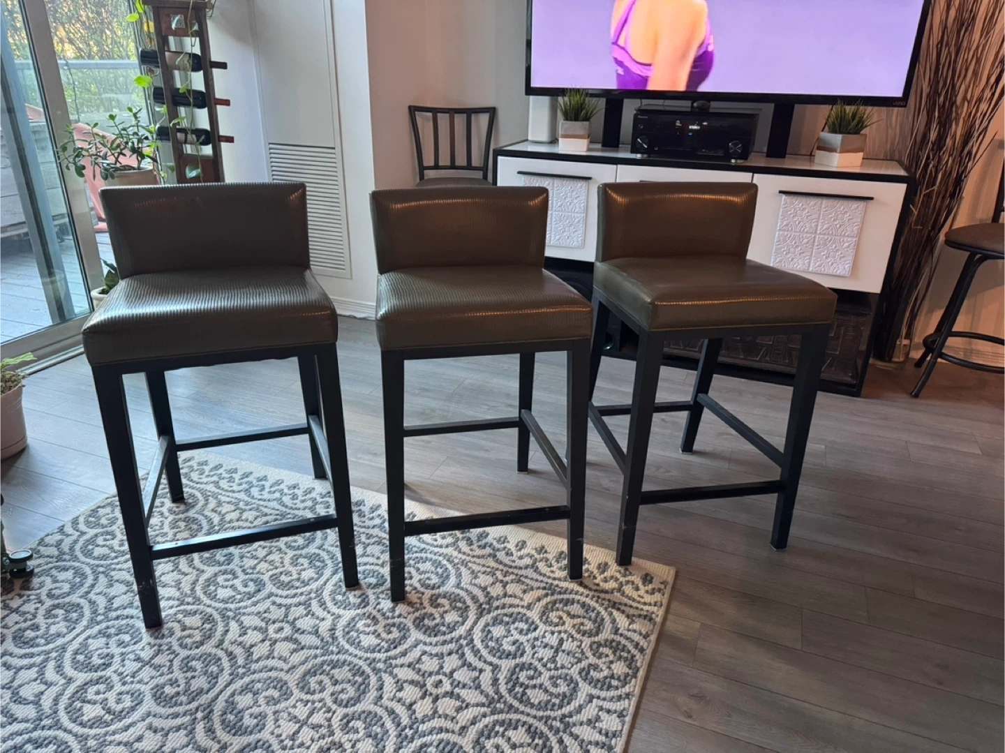 Selling a set of three bar stools! They feature a sleek black frame and a comfortable green seat. Perfect for adding a touch of modern style to your kitchen or bar area. They are in great condition and ready for a new home!