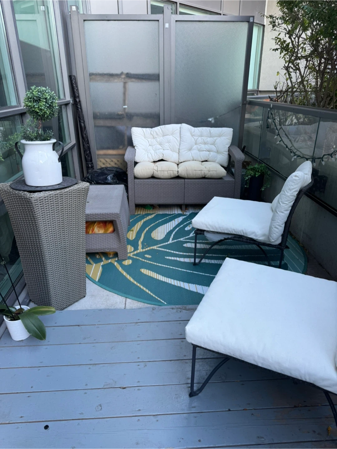 Selling a lovely outdoor patio furniture set! It includes a loveseat, two chairs, a small table, and a rug. Perfect for enjoying the nice weather on your balcony or patio. The furniture is in good condition and ready for a new home!