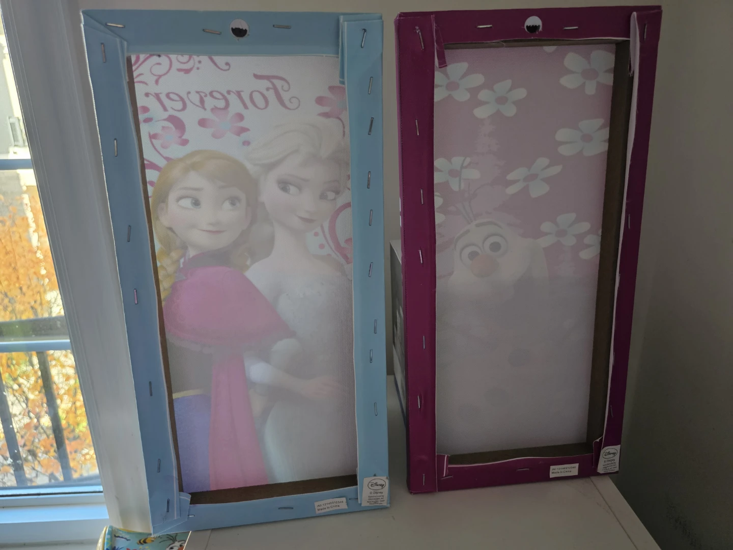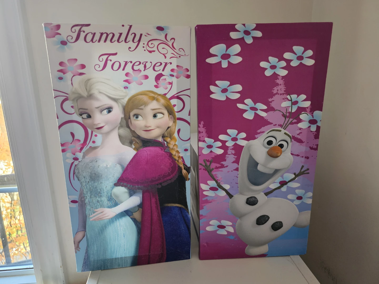 Selling a set of two Disney Frozen canvas wall art pieces featuring Elsa, Anna, and Olaf! These are perfect for adding a touch of Frozen magic to any room
