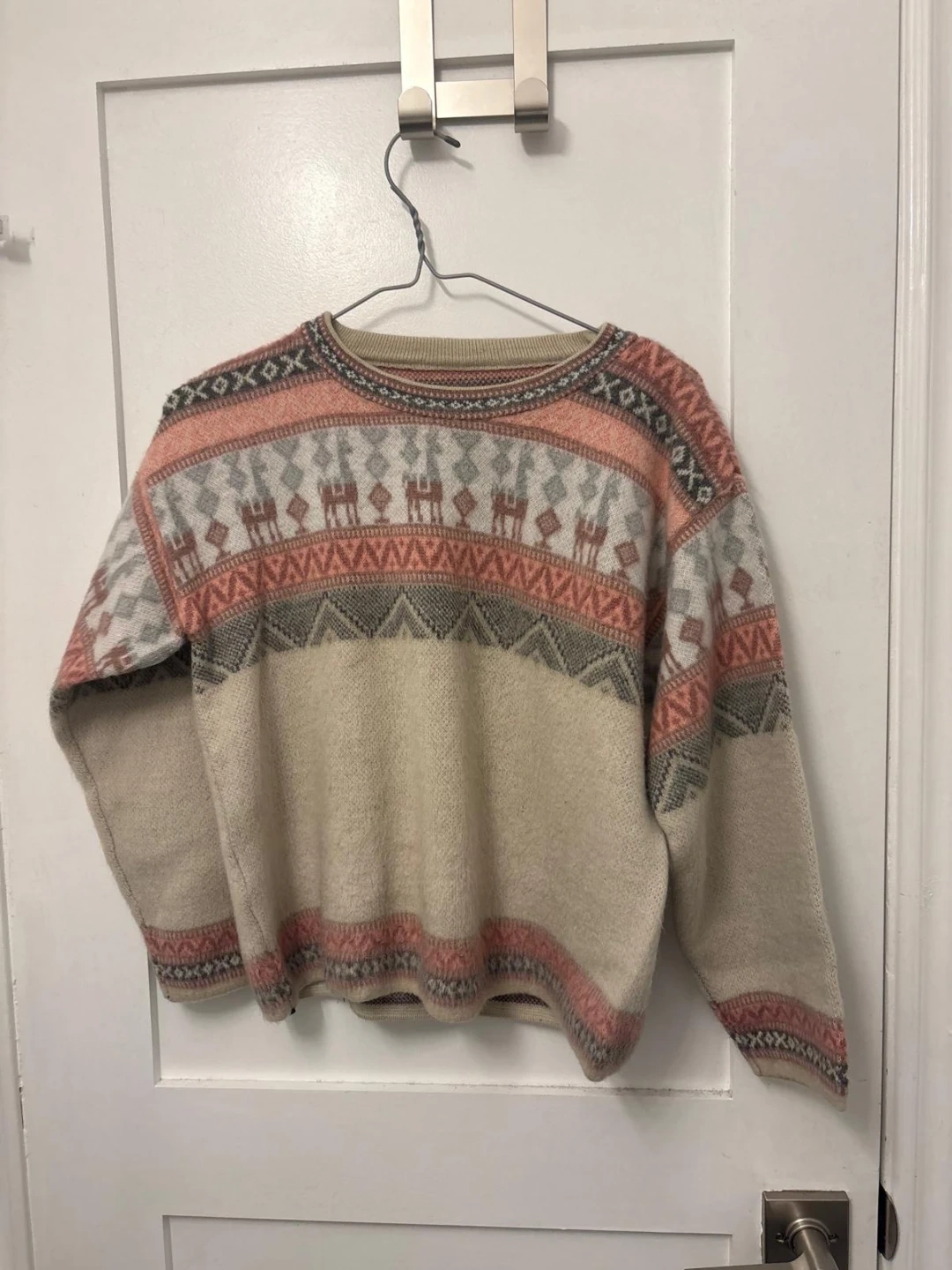Cozy vintage wool sweater with a unique patterned design. It's in good condition and perfect for staying warm during the colder months!