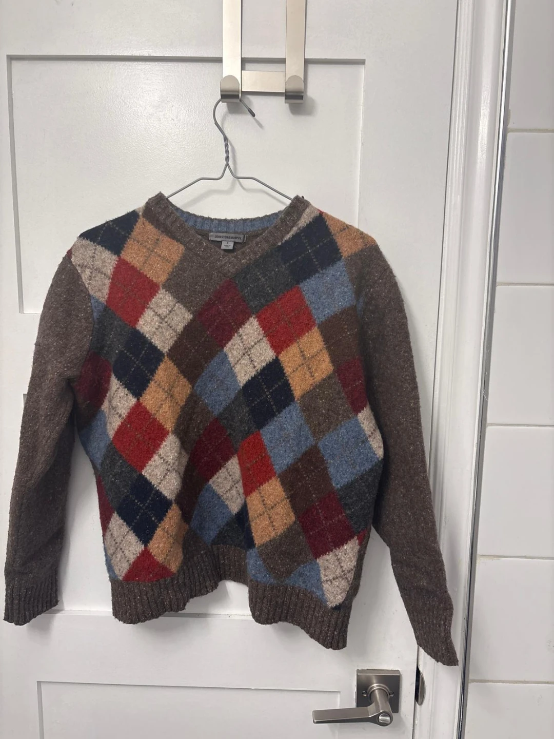 Cozy up with this Johnston & Murphy argyle sweater! It's a size large but fits "small and medium". It features a classic diamond pattern in a mix of colours. Perfect for adding a touch of warmth and style to your wardrobe!