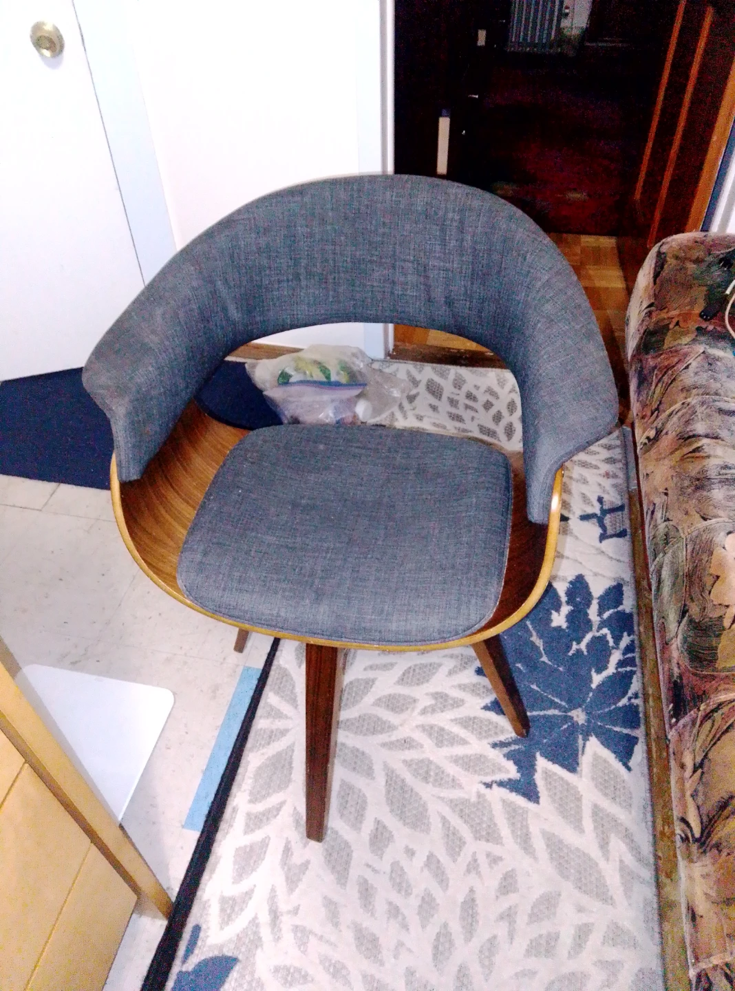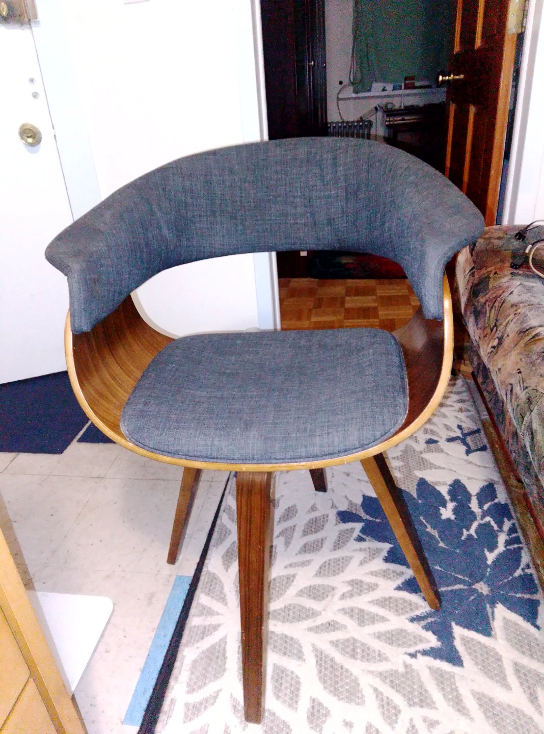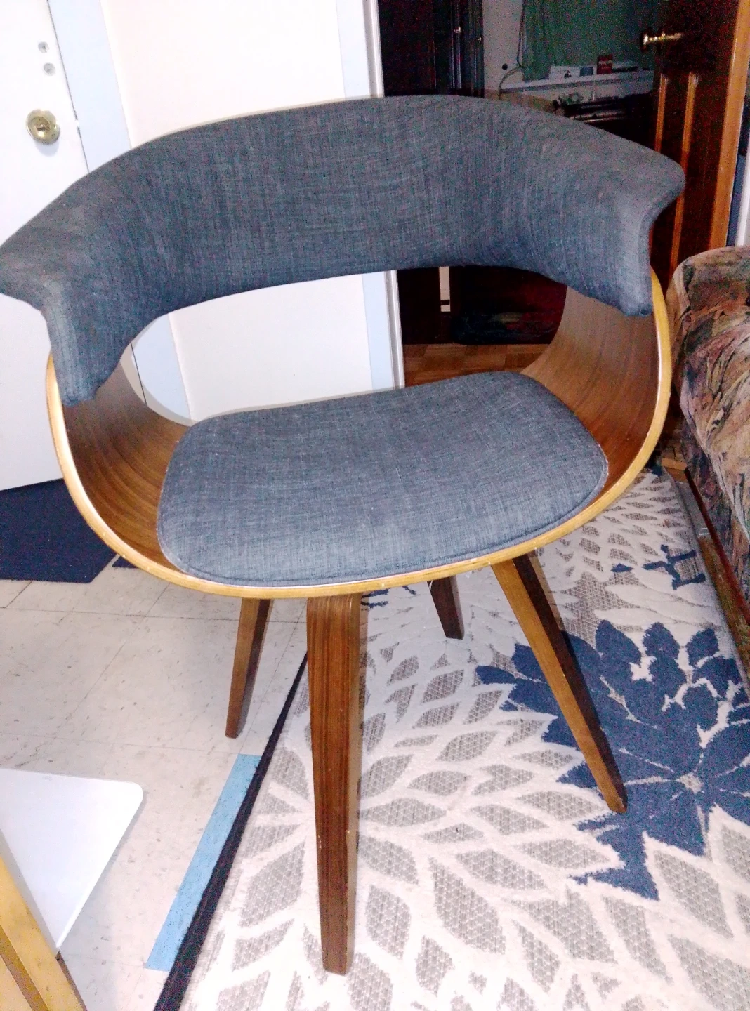 Here's a stylish mid-century modern accent chair. It features a gray upholstered seat and back with a wooden frame and legs. Great for adding a touch of retro flair to any room! This chair can be rotated in any direction, so you can spin the kids around like on a carousel.Personal pickup and Cash or Cash app accepted , thank you π₯The retail price for a Mid-Century Modern Style Accent Chair in the US typically ranges from $139.86 to $1,898, with many retailers offering sales prices often starting around $200-$300.
