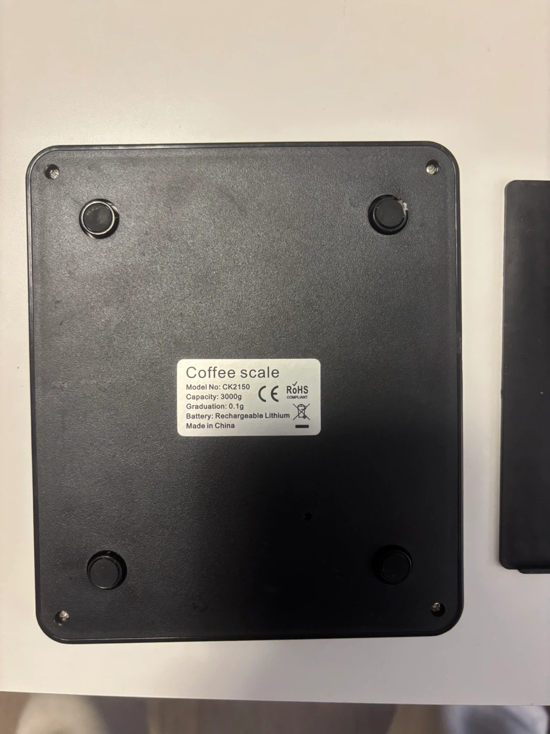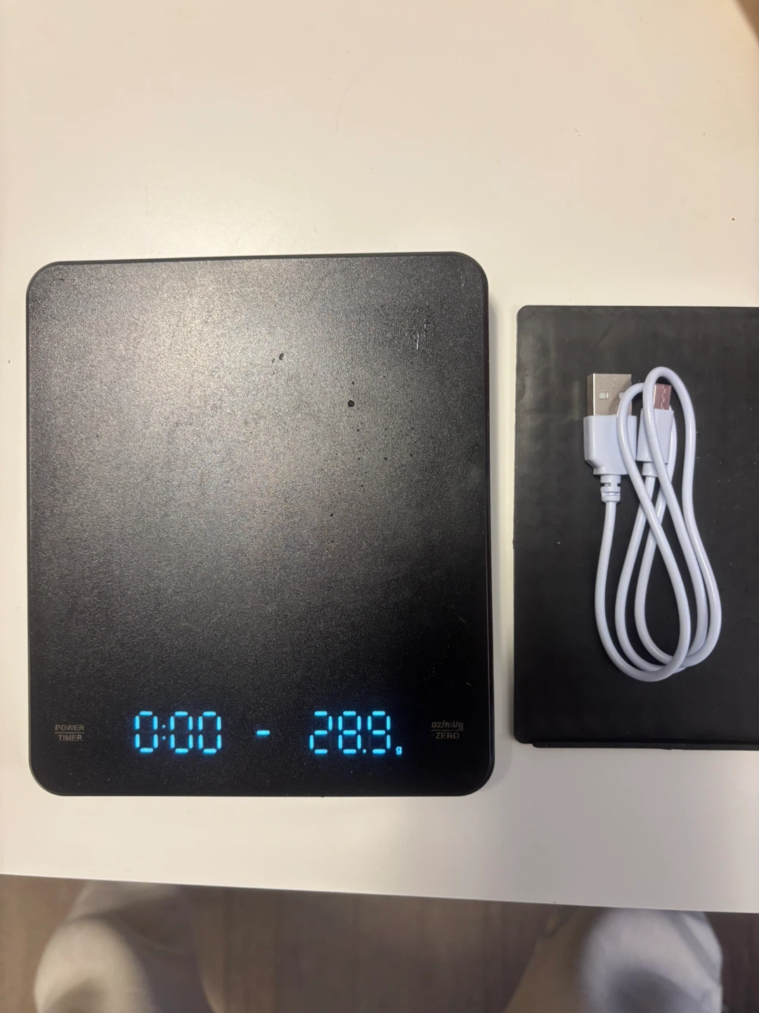 Selling a coffee scale. It's a digital kitchen scale that can measure up to 3000g with a graduation of 0.1g. Comes with a rechargeable lithium battery and a USB charging cable, plus the user manual