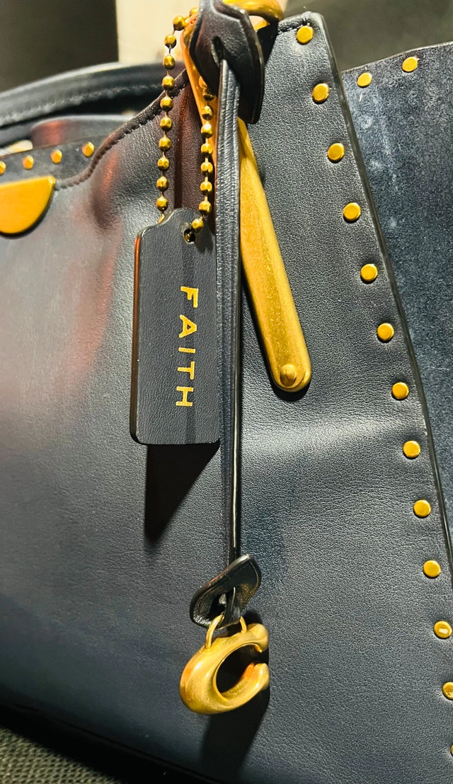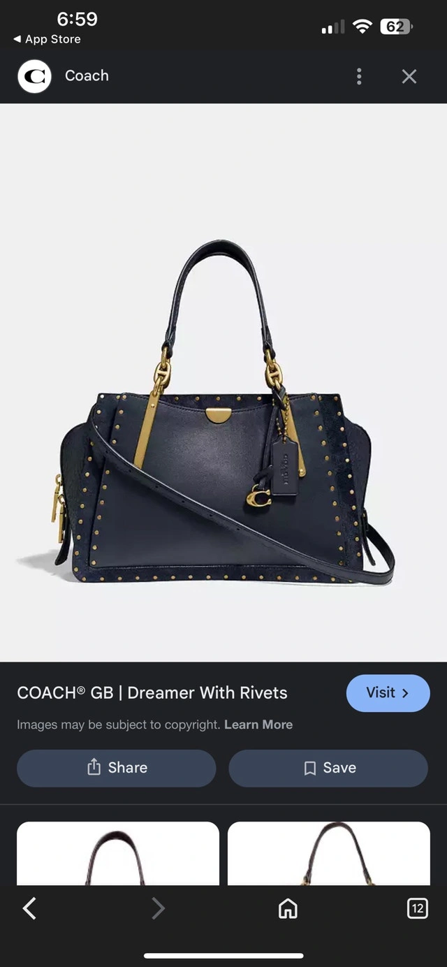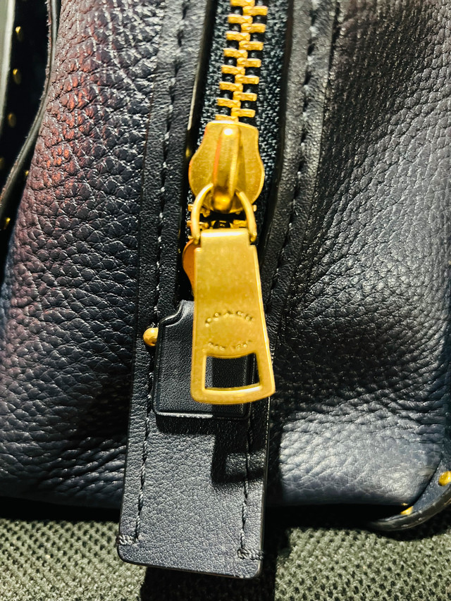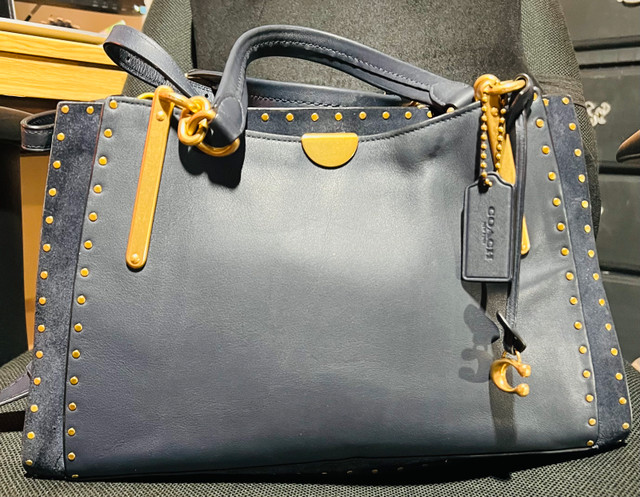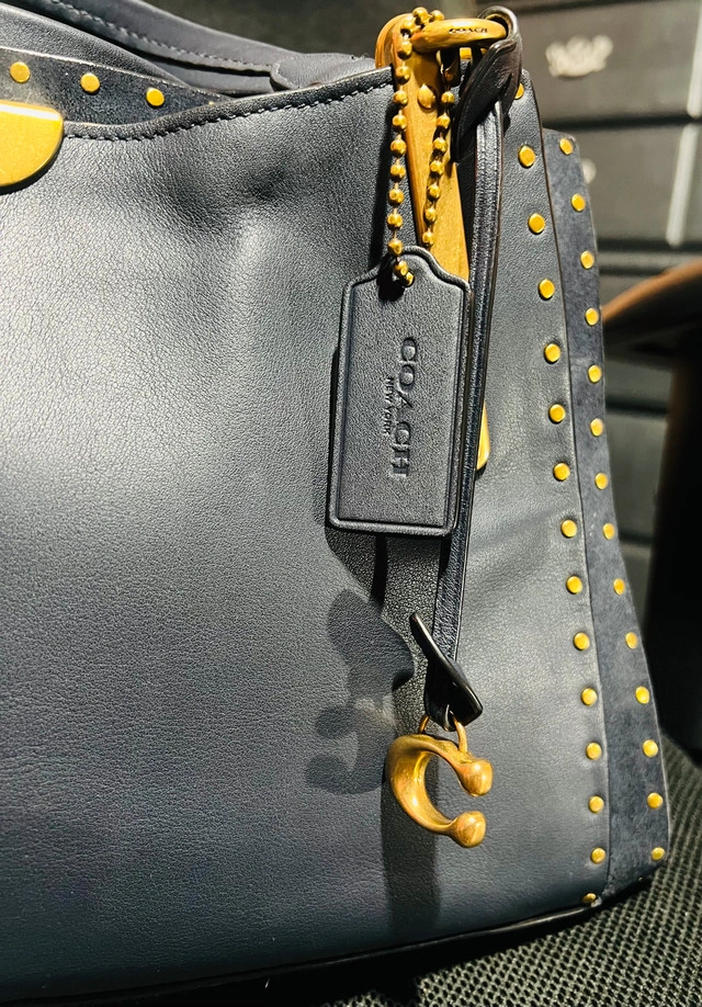 This is a used Coach Dreamer 36 handbag with rivets in navy blue. It's a stylish and functional bag. It has been used and has some signs of wear, but overall it's in amazing condition. Colour: Navy Blue. Hardware: Gold-tone. Style: Satchel/Shoulder Bag. This bag has plenty of life left and is waiting to accompany you on your next adventure, whether it's a trip to the city or a casual day out. Just a friendly heads-up: if you're seeing this ad, the Coach Dreamer is still available!