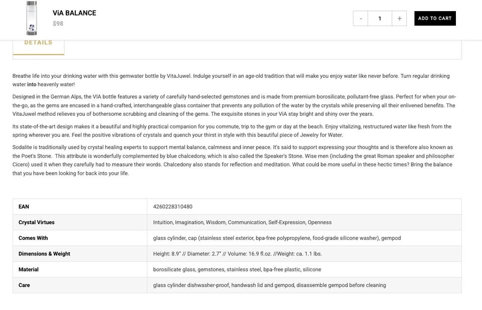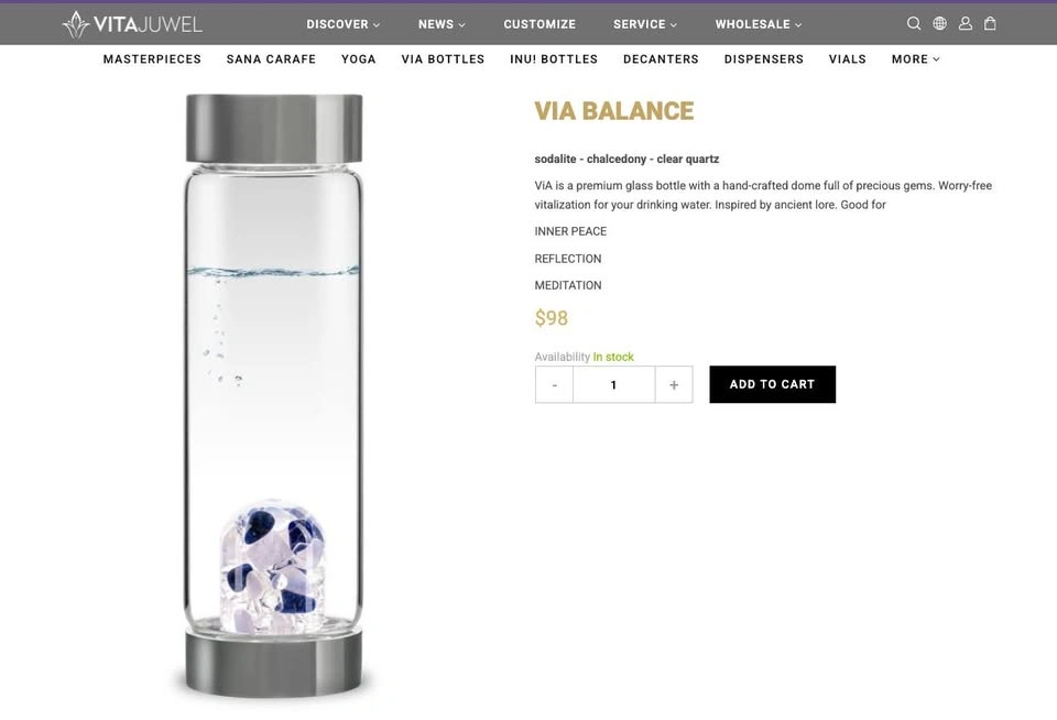 ViA is a premium glass bottle with a hand-crafted dome full of precious gems. Worry-free vitalization for your drinking water. Inspired by ancient lore. Good for