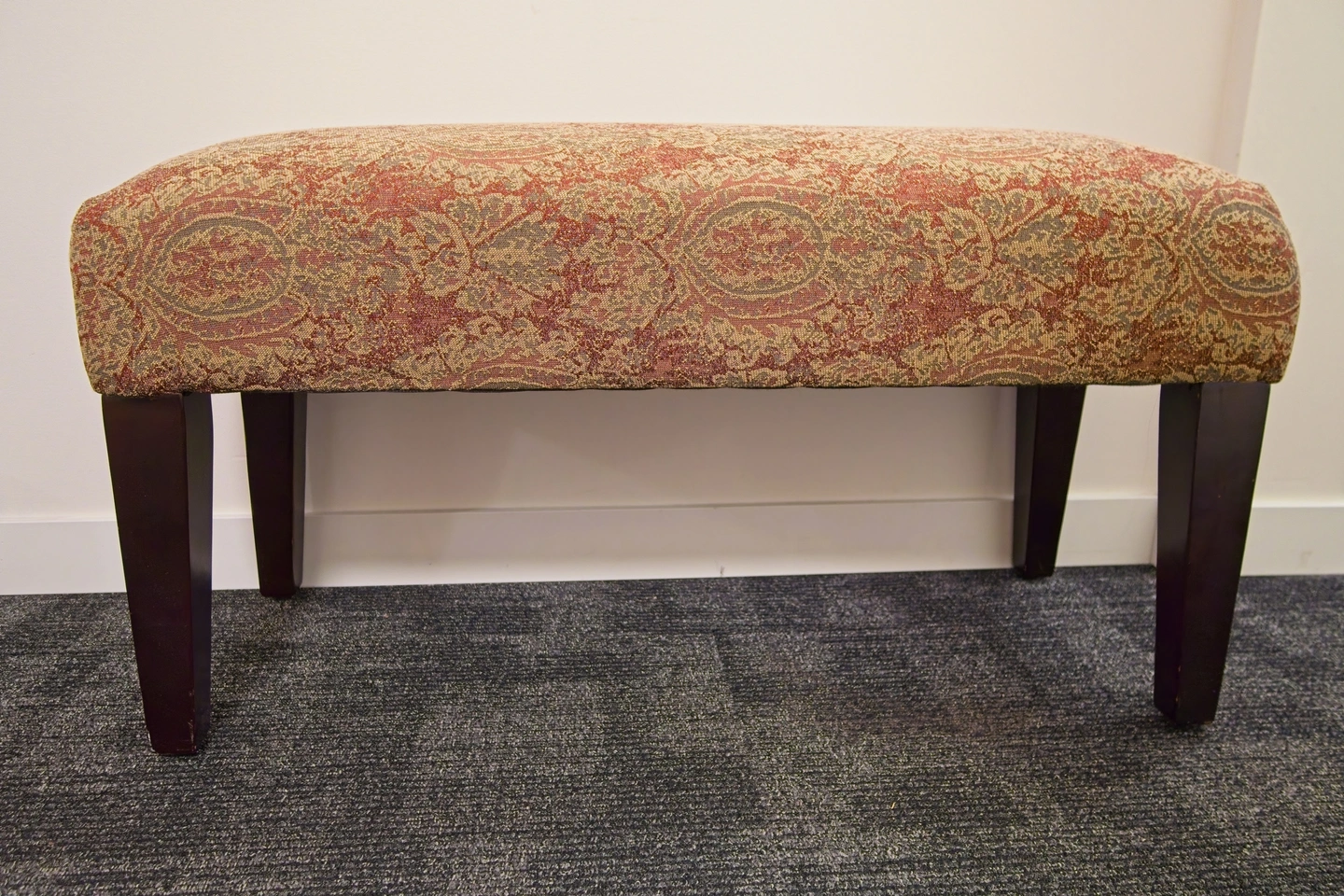 Bring a touch of timeless charm to your home with this beautiful upholstered bench! The warm red and gold tapestry fabric has that perfect vintage vibe, and the dark wooden legs give it an elegant, classic look.