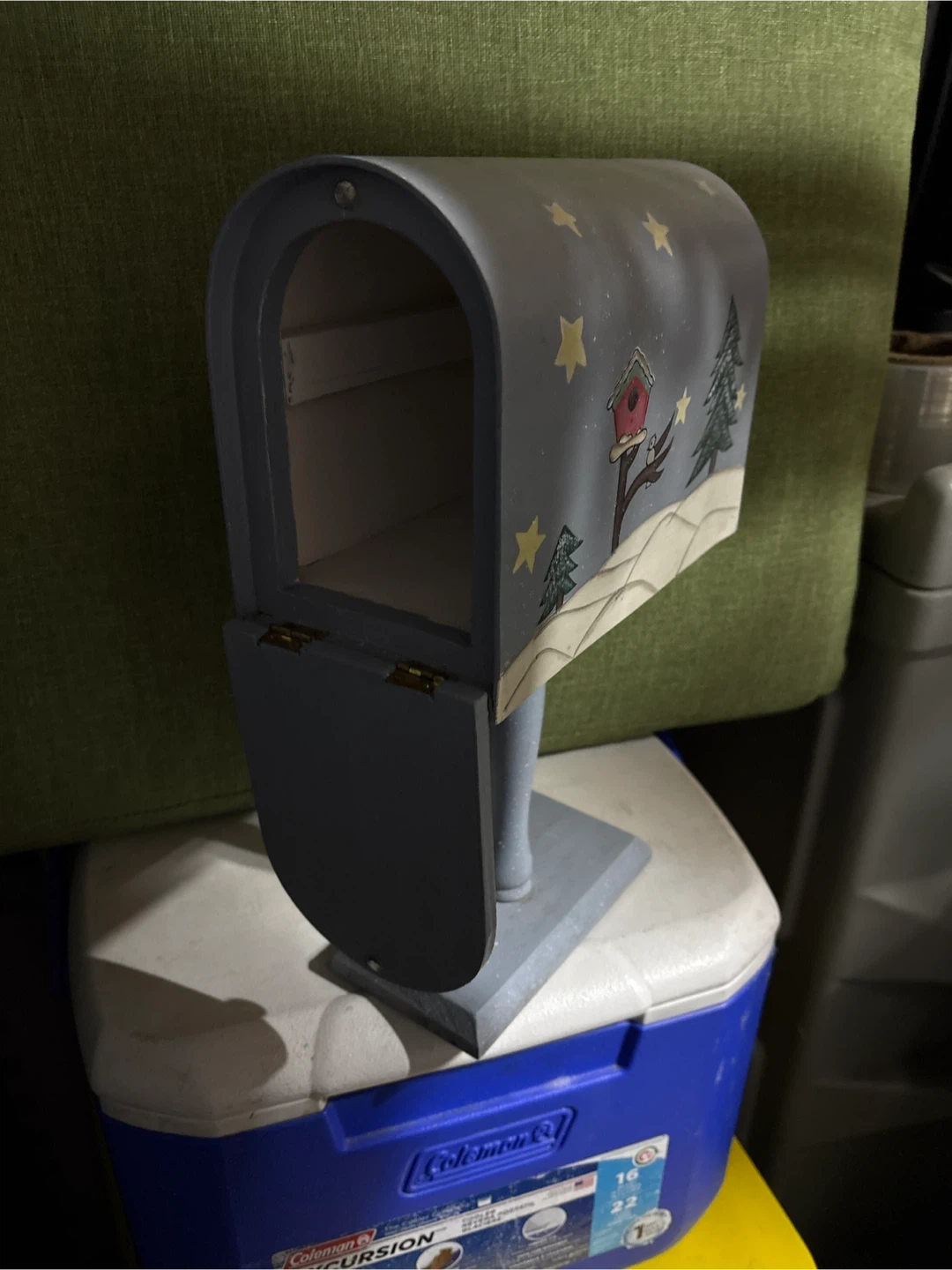 This is a cute hand-painted wooden mailbox decoration, perfect for the holidays! It features a charming winter scene with stars, a birdhouse, and pine trees. It is in great condition and would make a lovely addition to your holiday decor