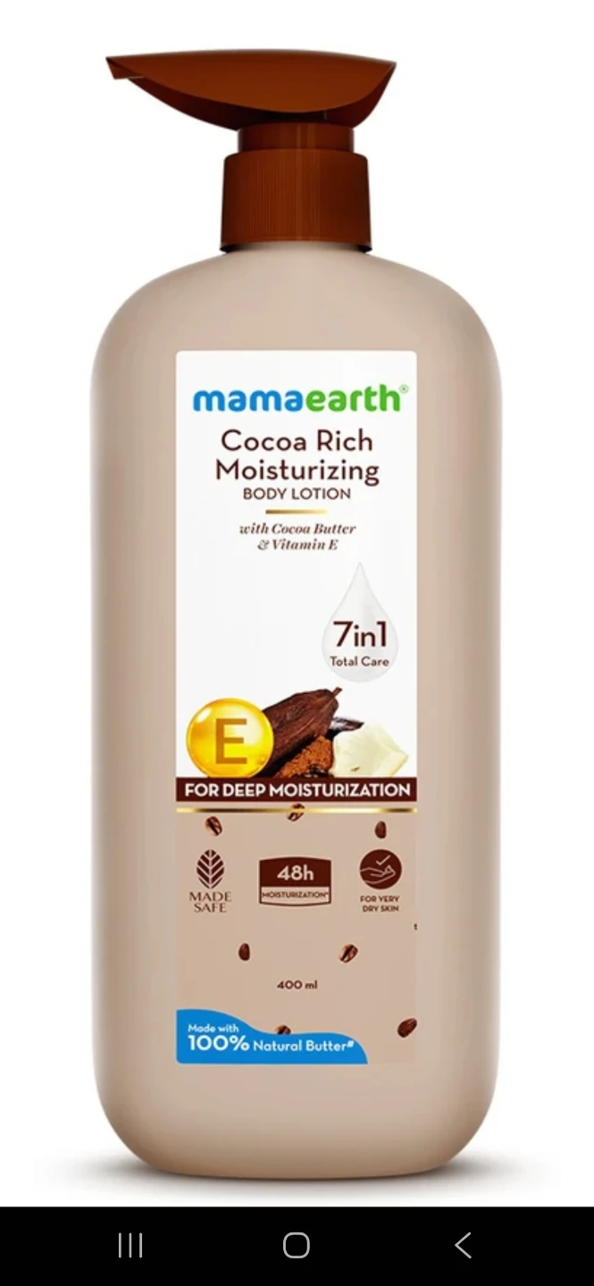 I'm selling a Mamaearth Cocoa Rich Moisturizing Body Lotion. It's a 7in1 total care lotion with cocoa butter and Vitamin E for deep moisturization. It's made safe and provides 48h moisturization for very dry skin with 100% natural butter. The bottle contains 400ml
