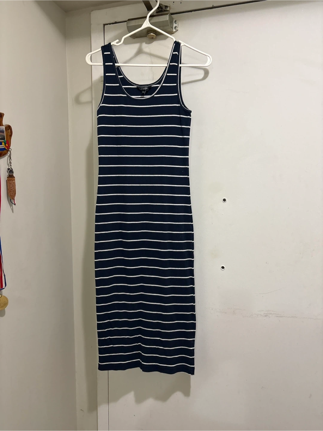 George tank dress in navy blue with white horizontal stripes. It's a ribbed knit material, size medium. This dress is perfect for casual wear on warmer days!